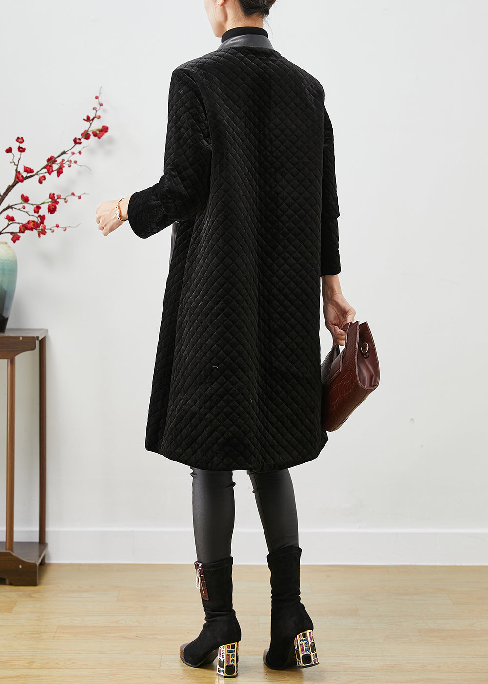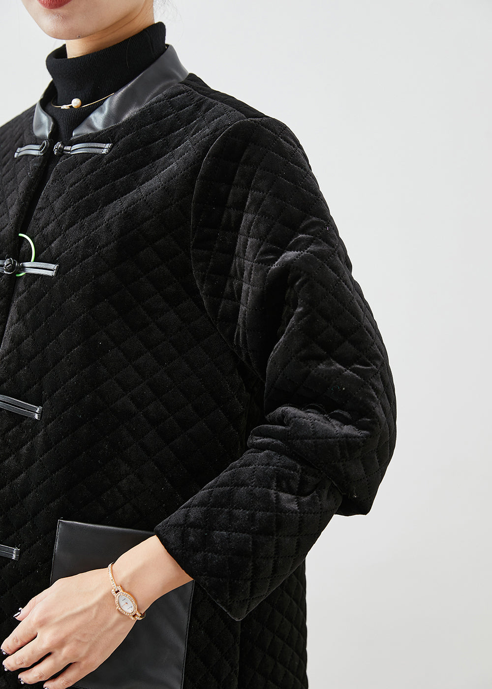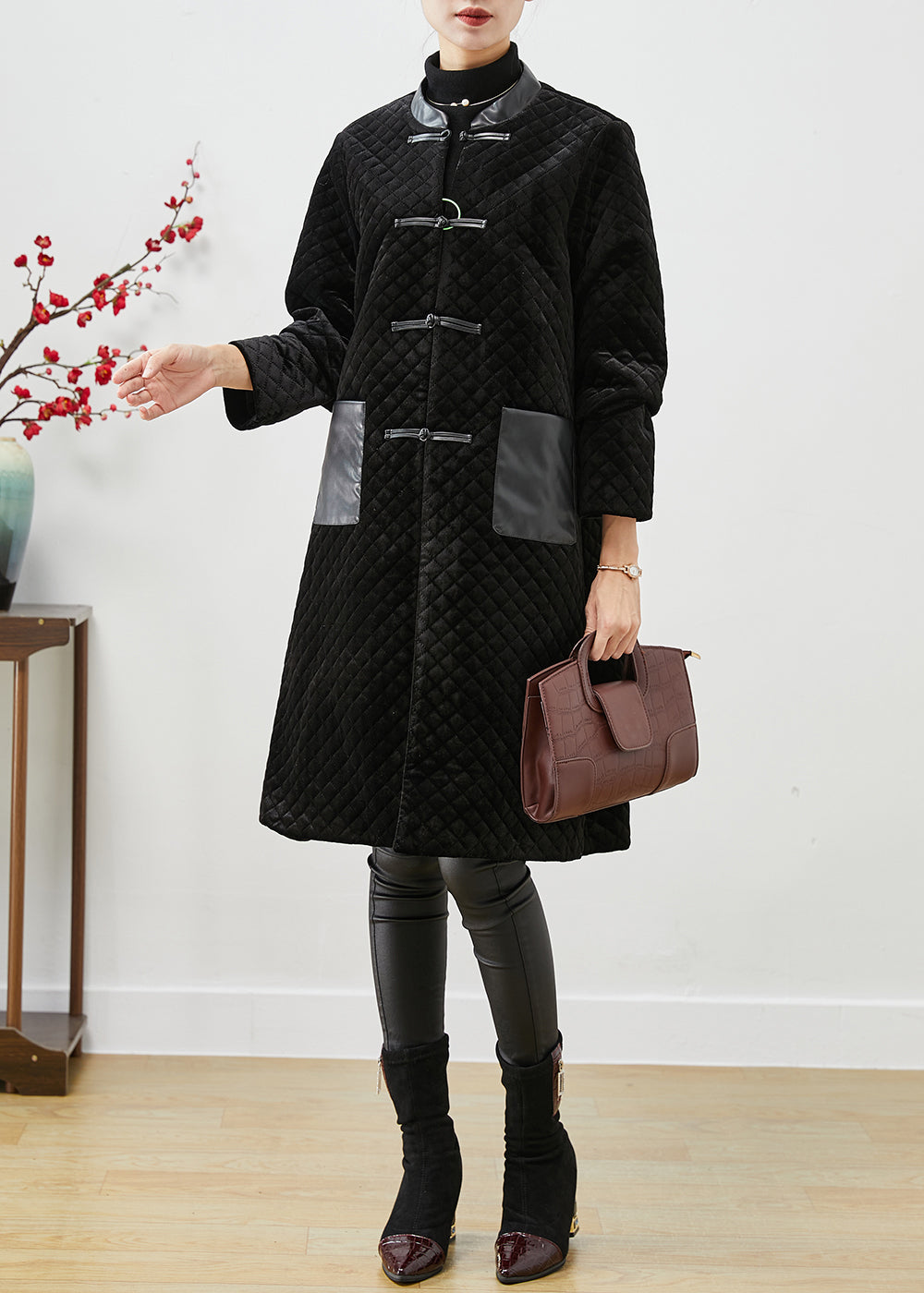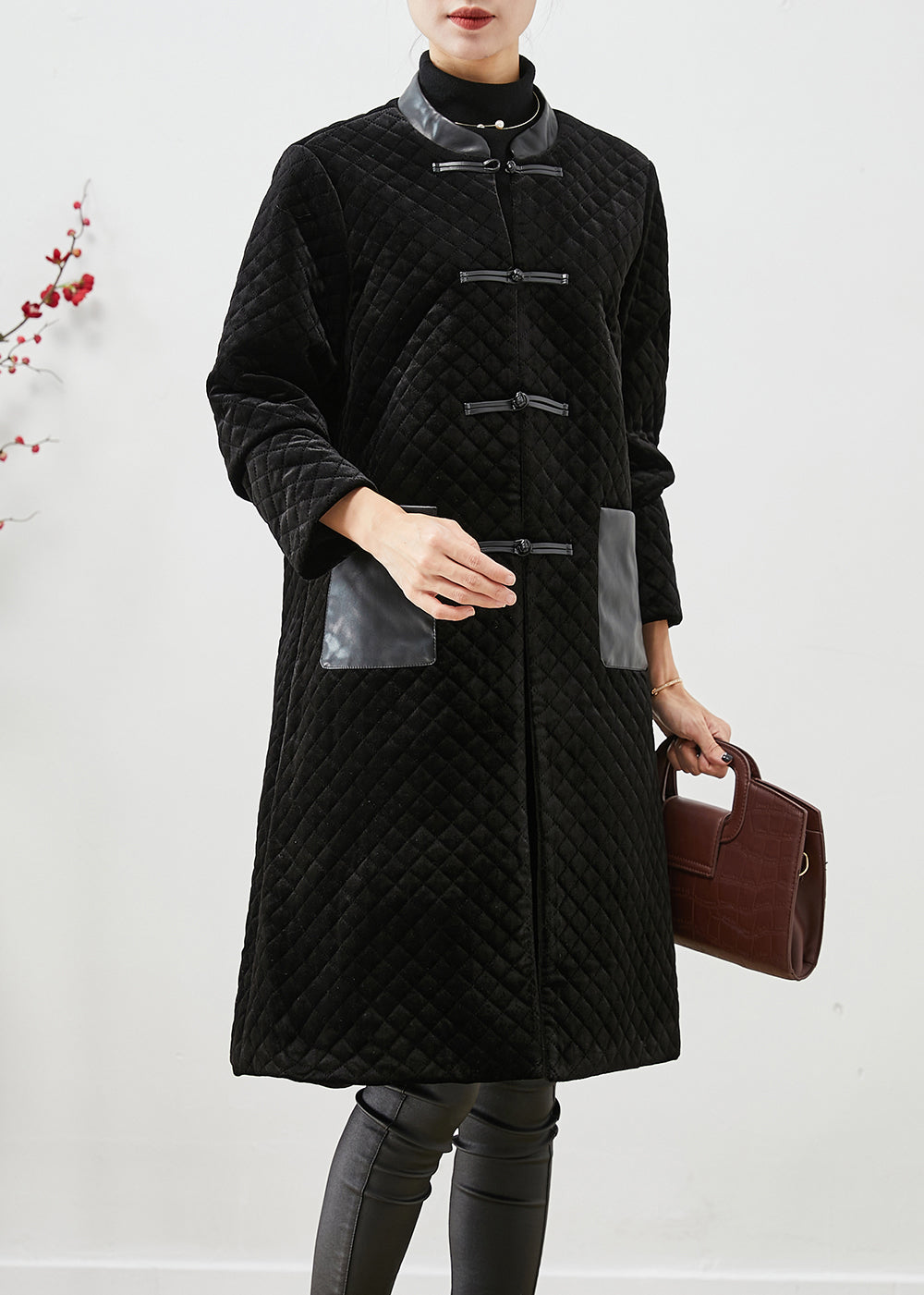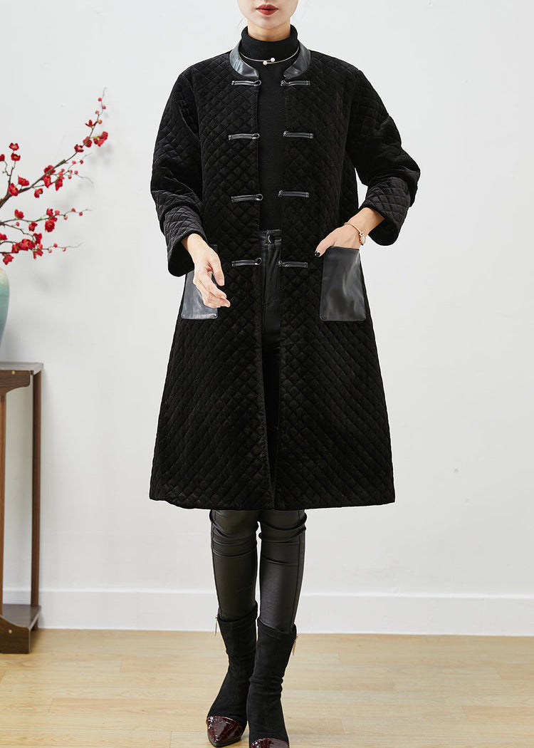 Women Black Patchwork Pockets Silk Velour Fine Cotton Filled Coats Winter