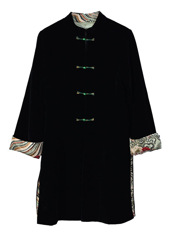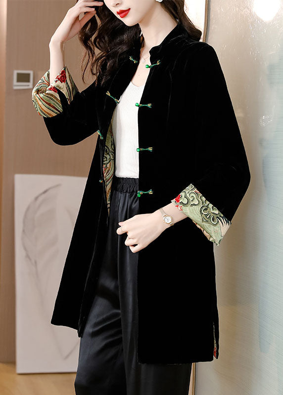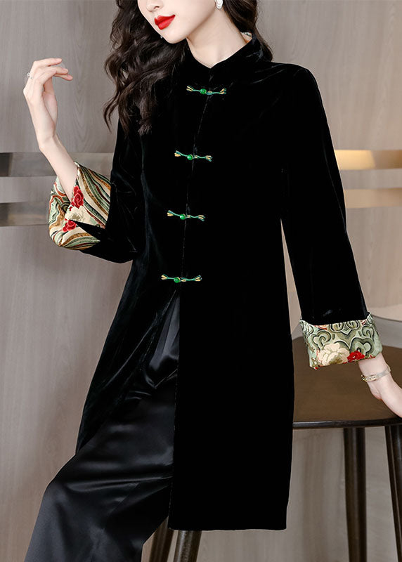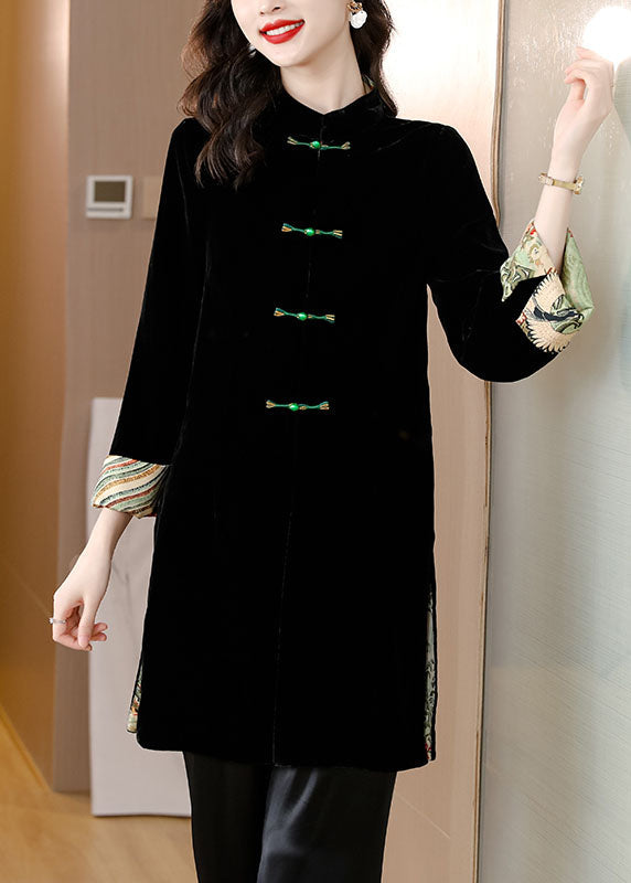Women Black Stand Collar Patchwork Button Silk Velour Coat Bracelet Sleeve
