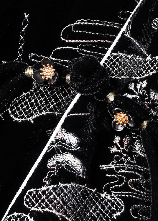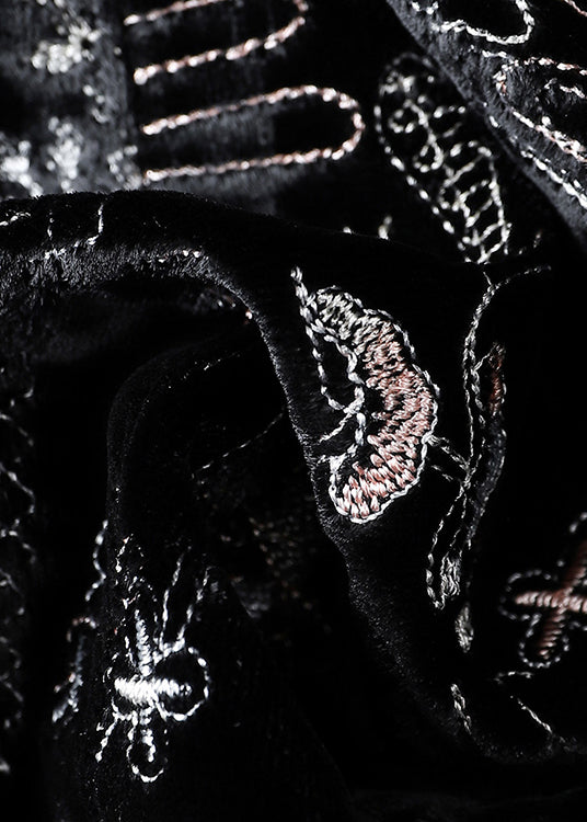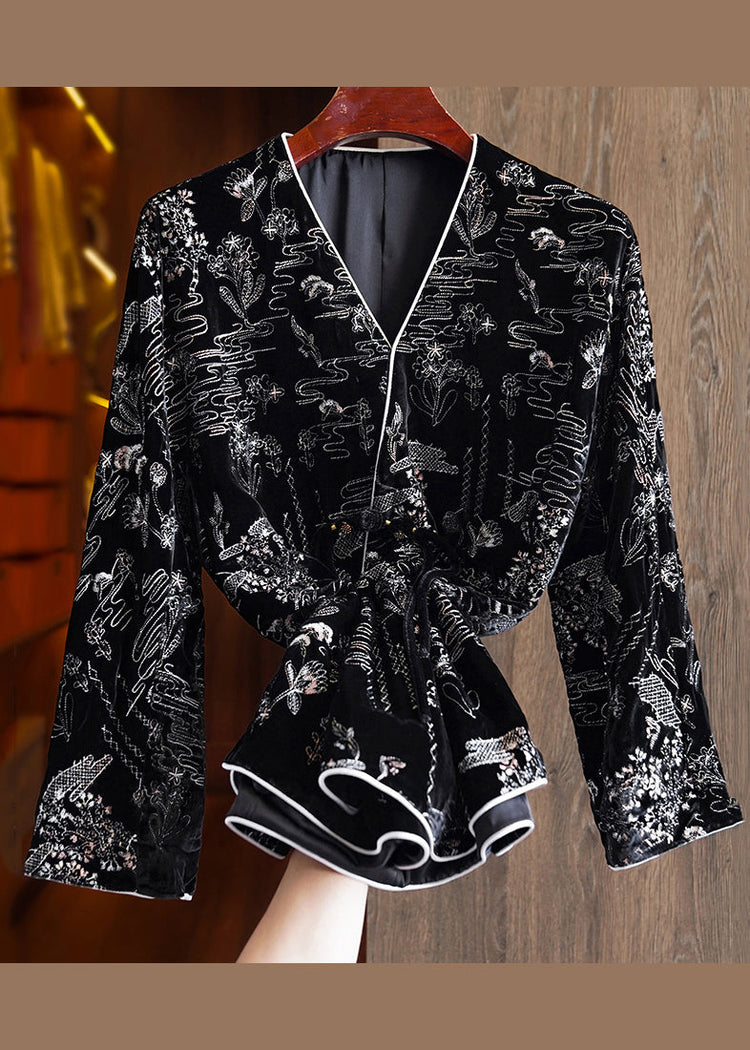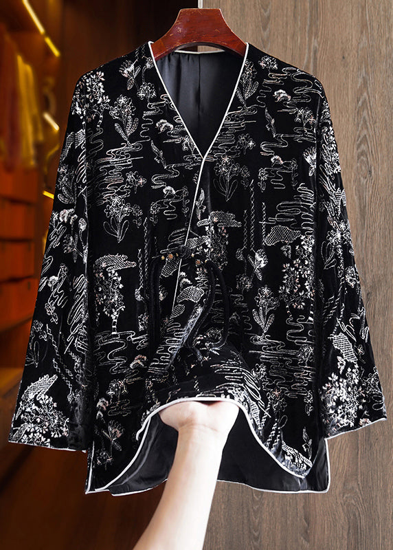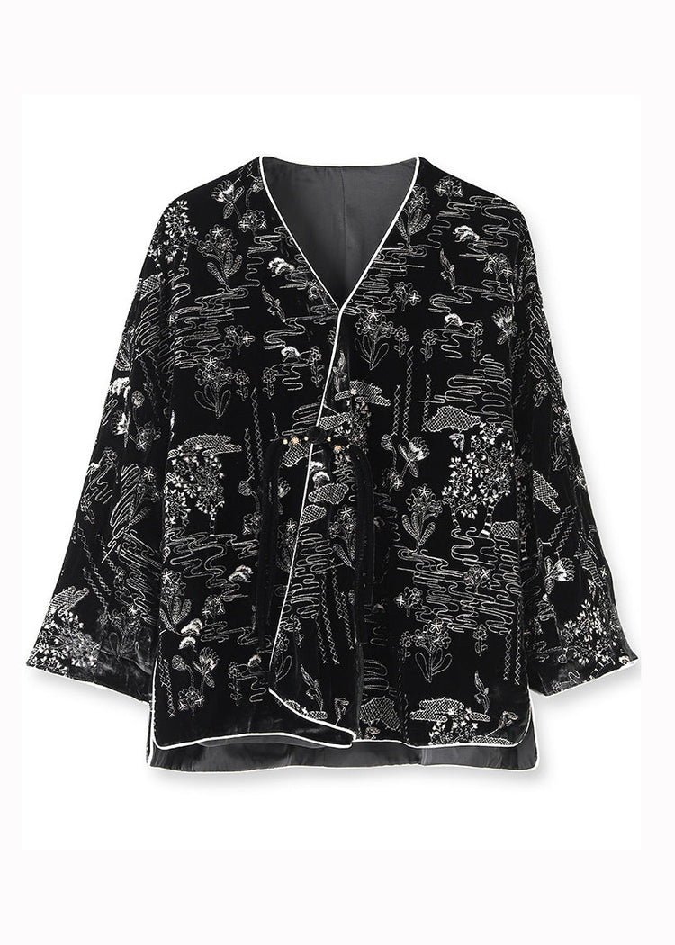 Women Black V Neck Jacquard Patchwork Silk Velour Coats Fall