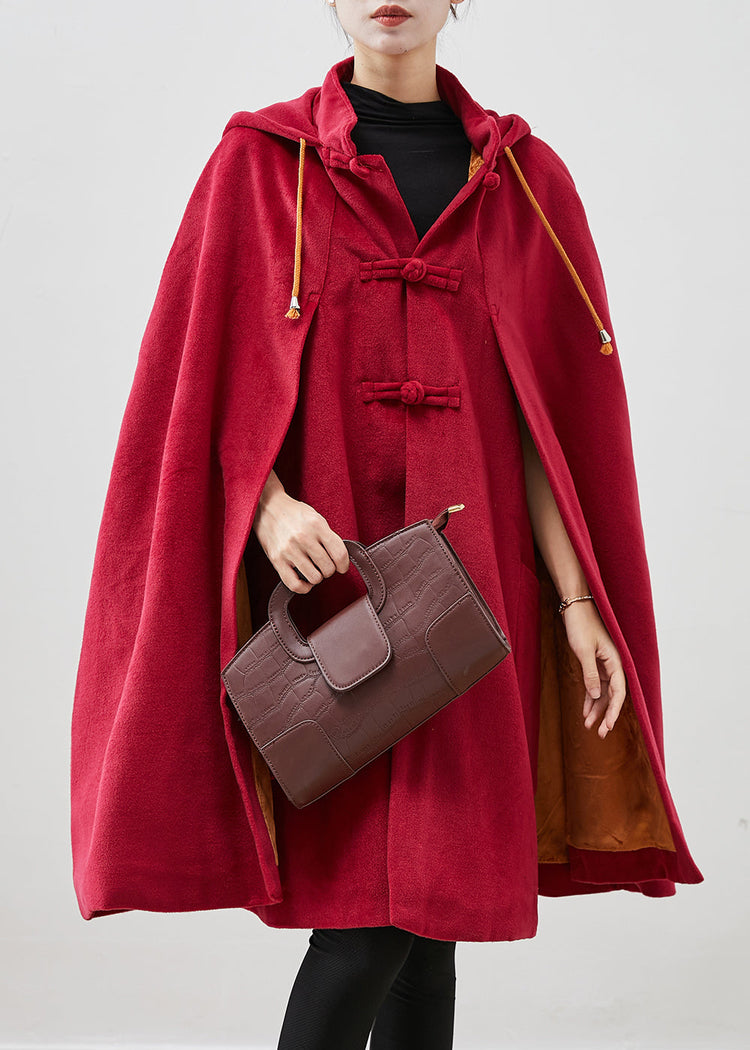 Women Red Hooded Chinese Button Warm Fleece Coats Cloak Sleeves
