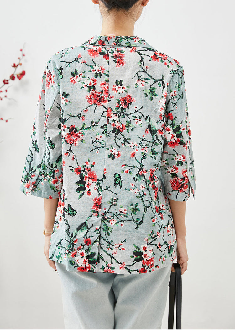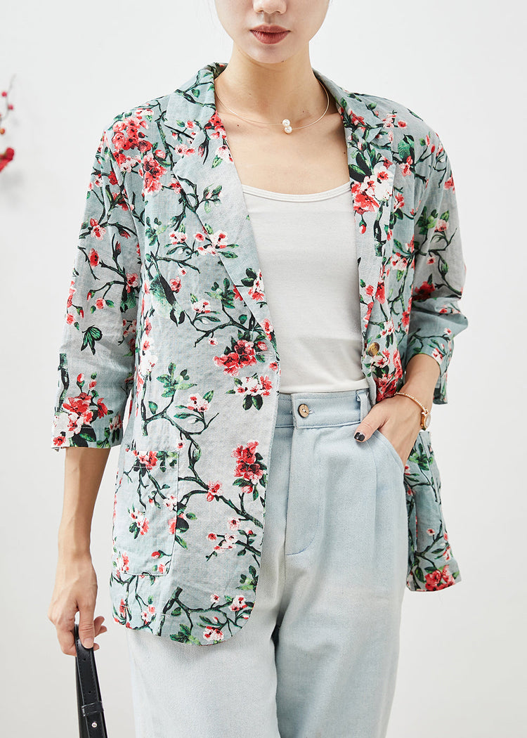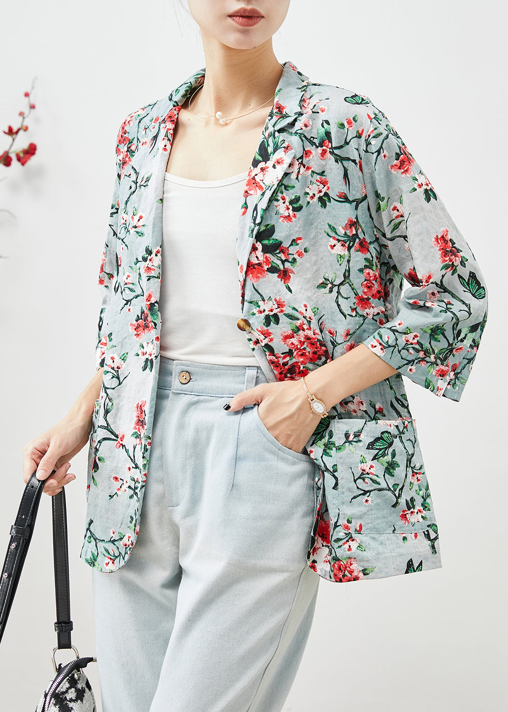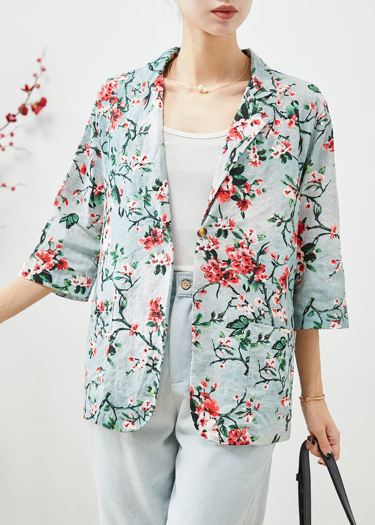 Women Slim Fit Plum Blossom Print Pockets Linen Coats Half Sleeve