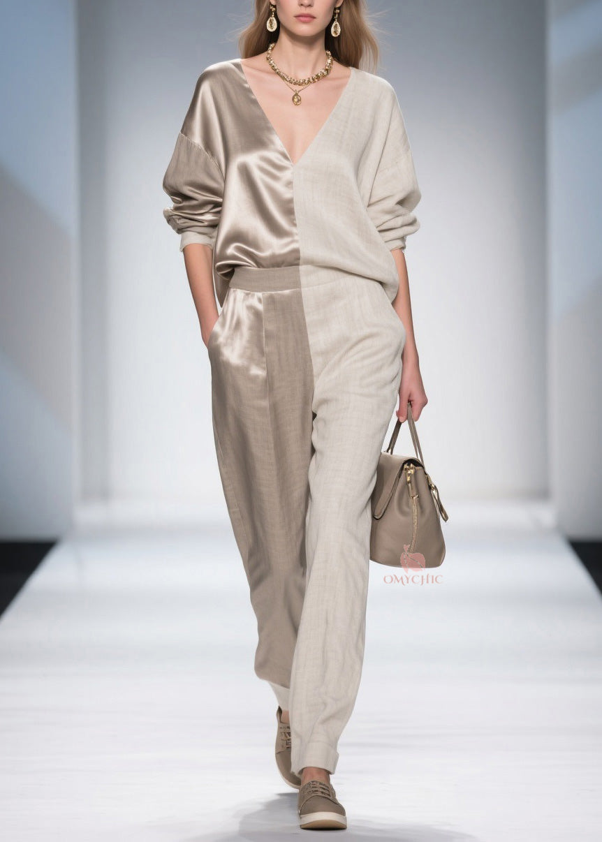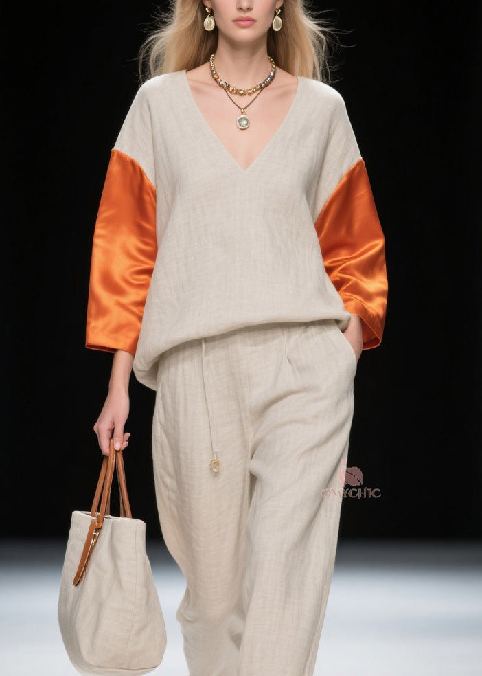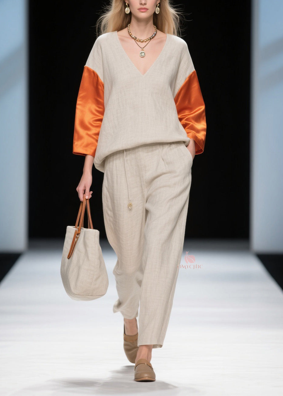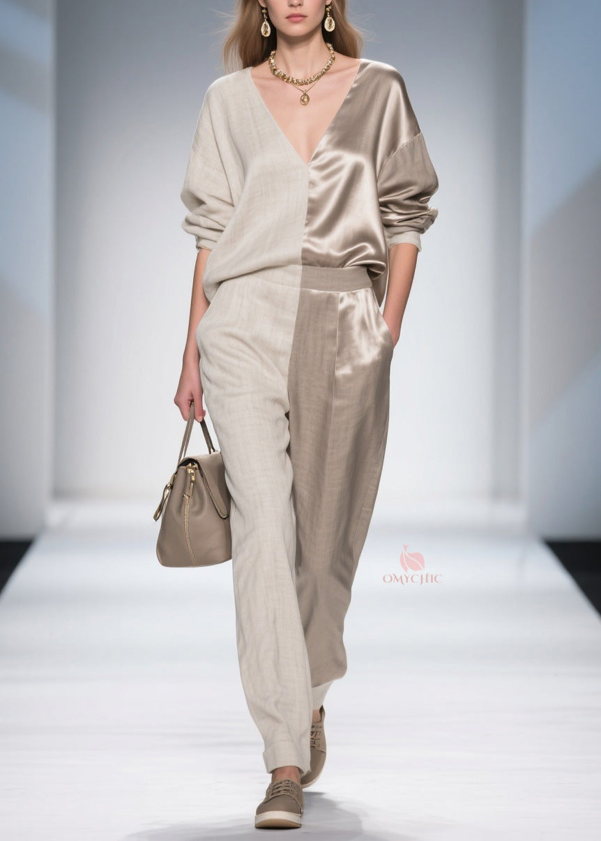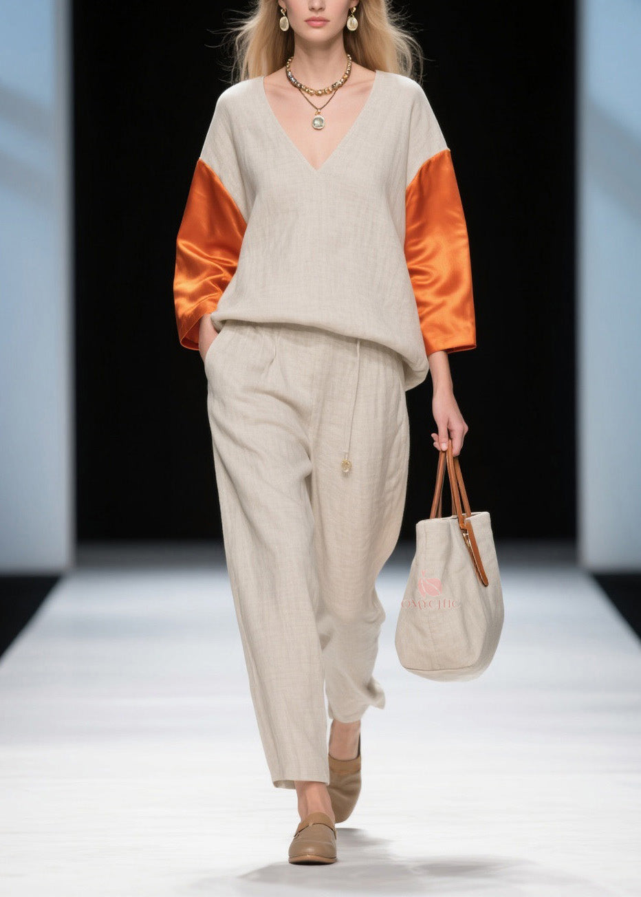 Organic Colorblock V Neck Silk Patchwork Linen Sets 2 Pieces Spring