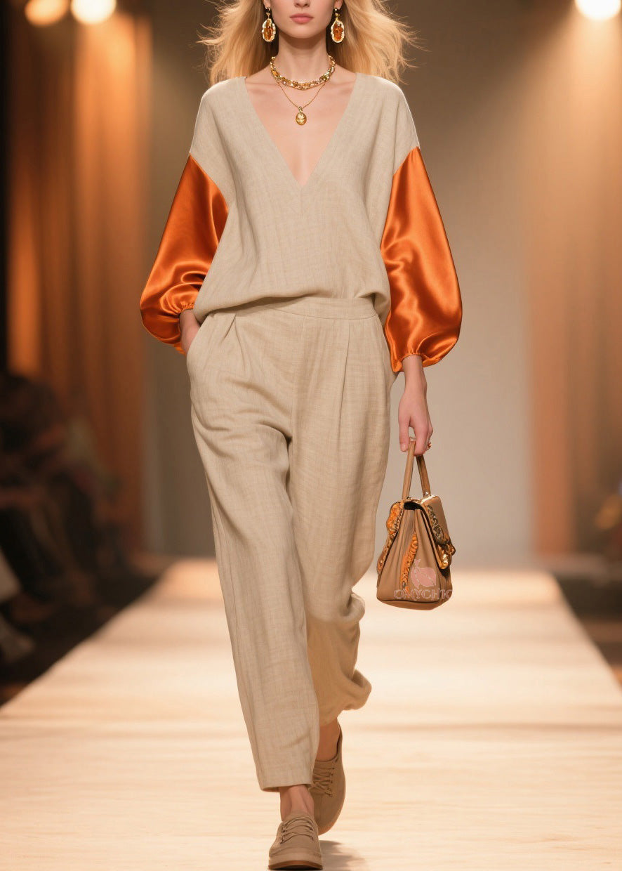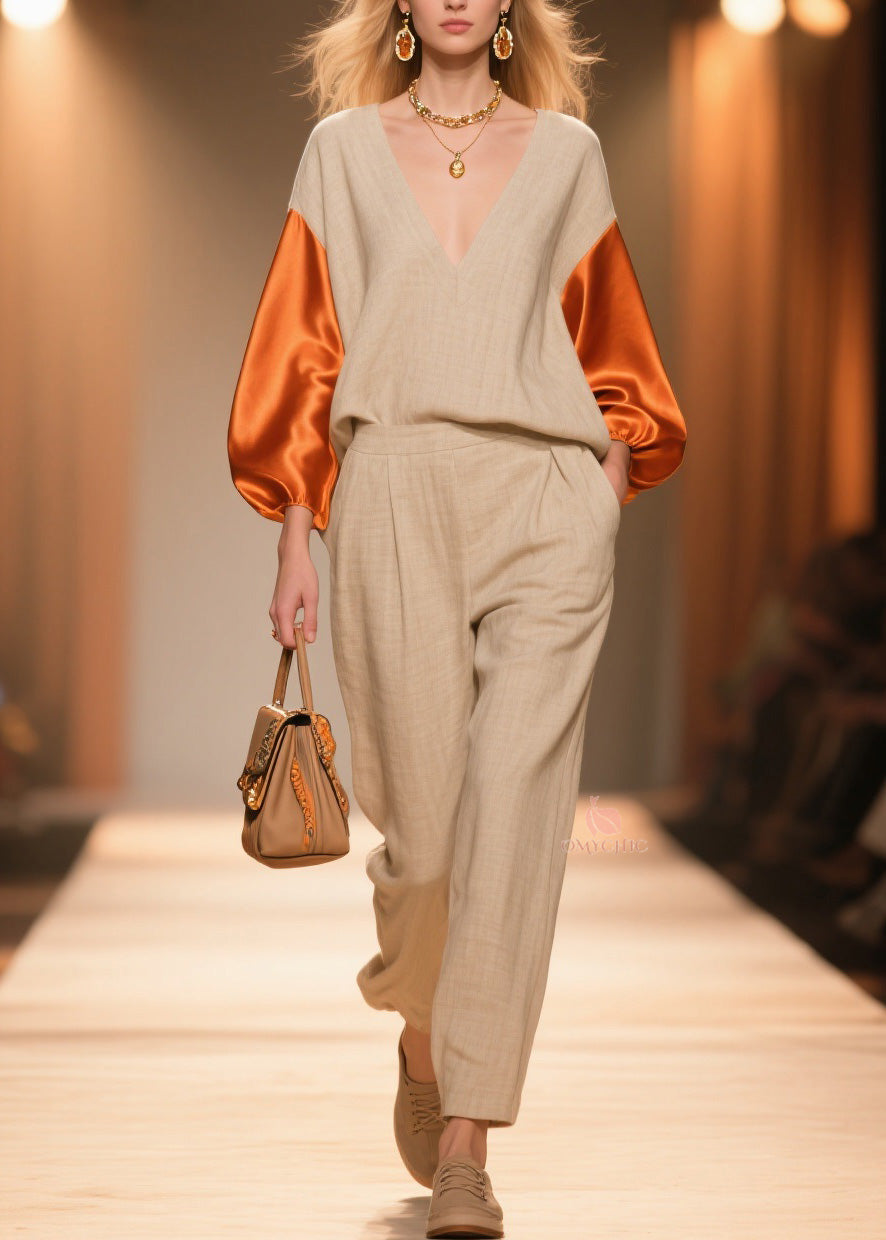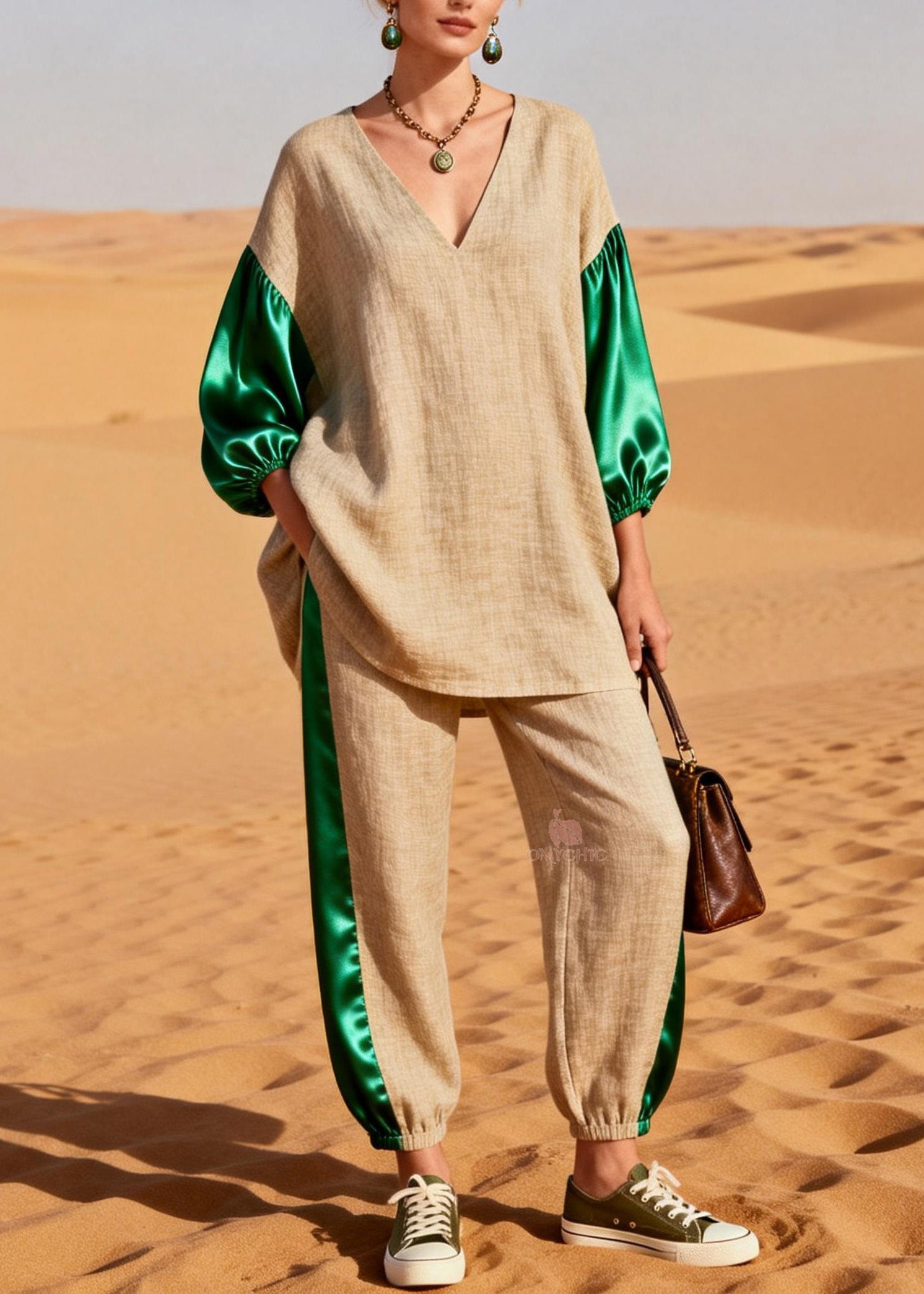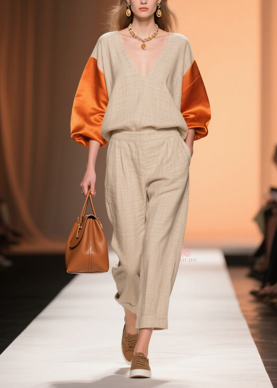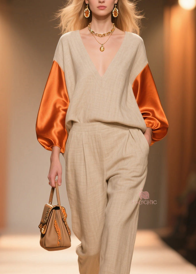 Organic Colorblock V Neck Silk Patchwork Linen Sets 2 Pieces Spring