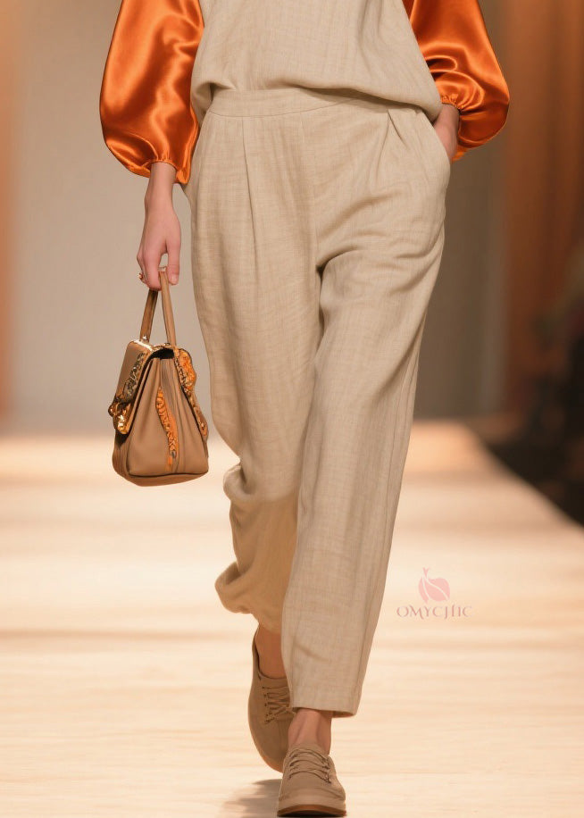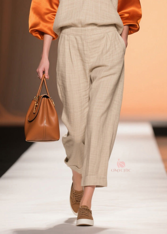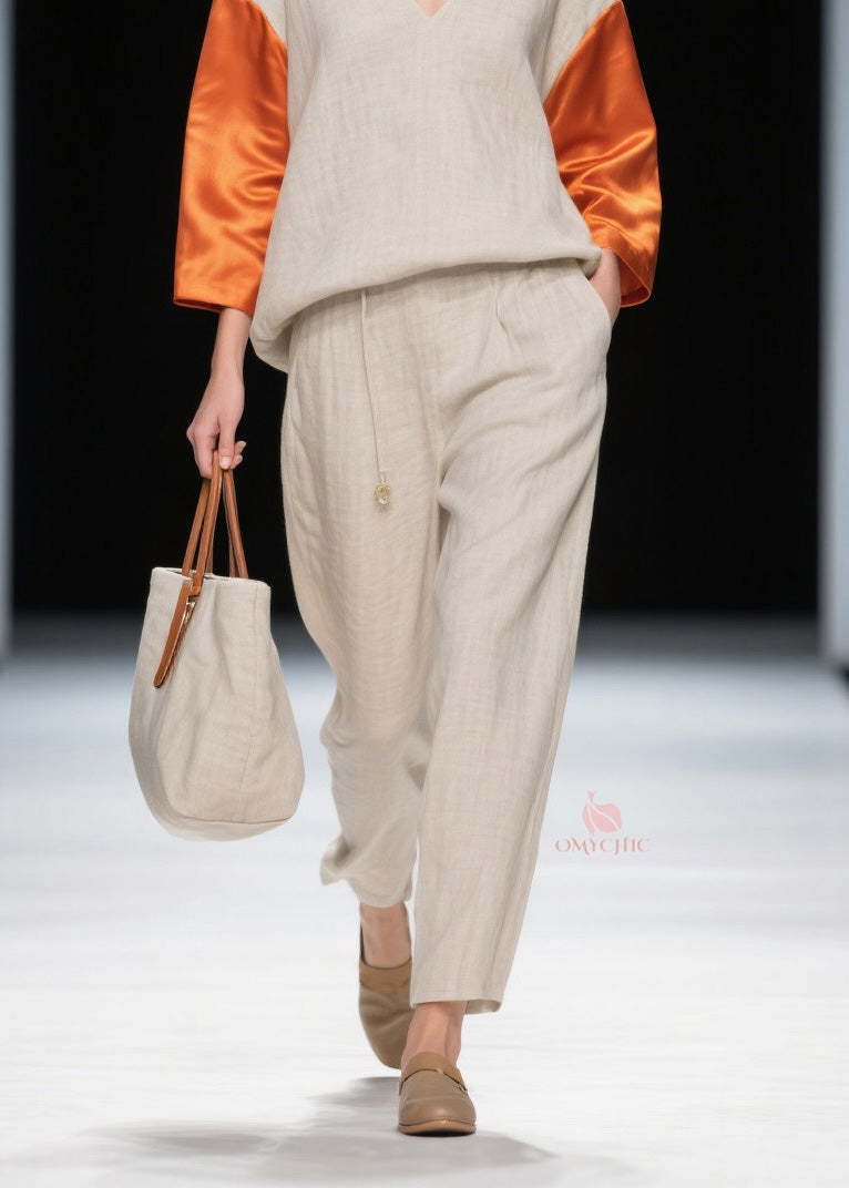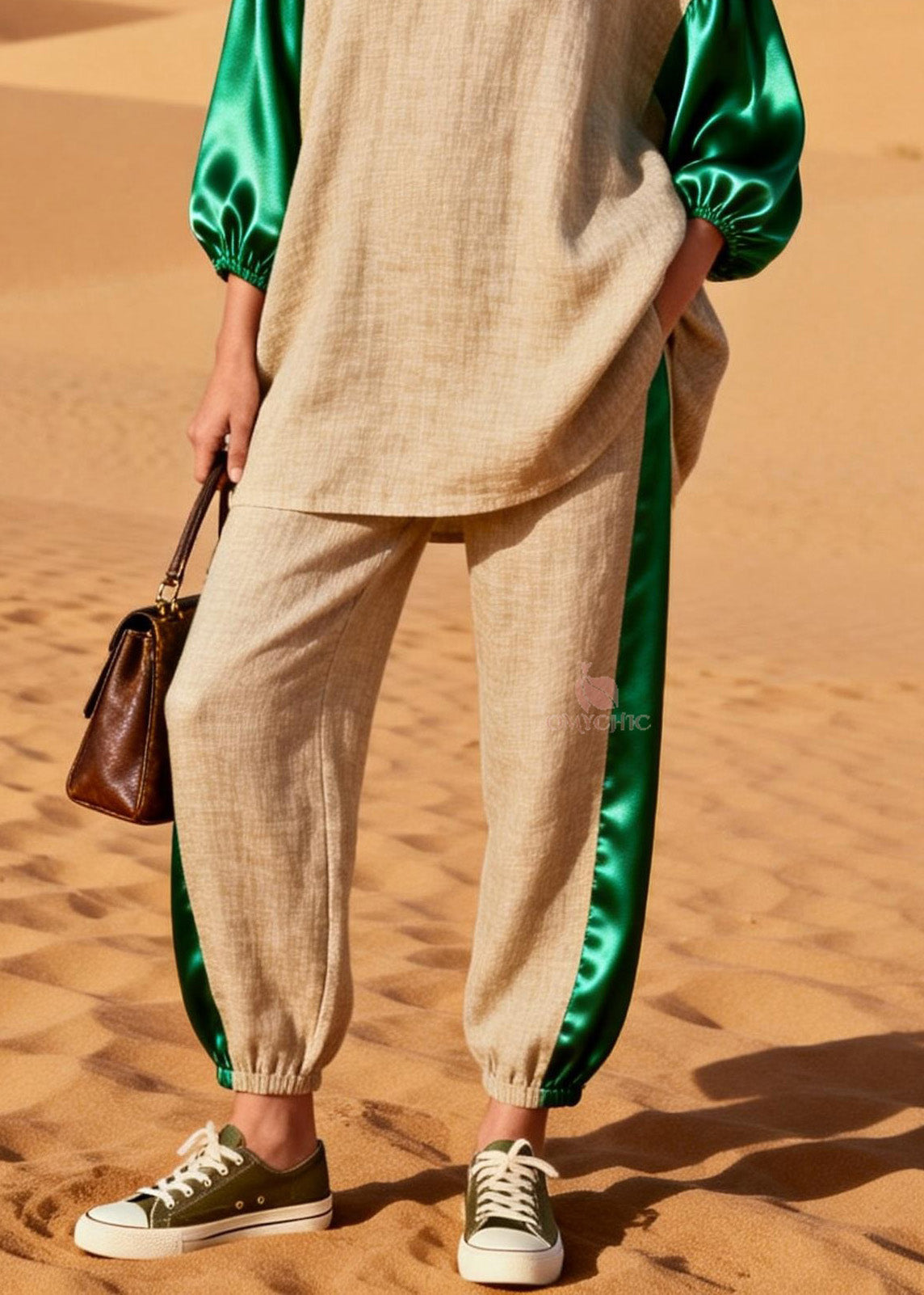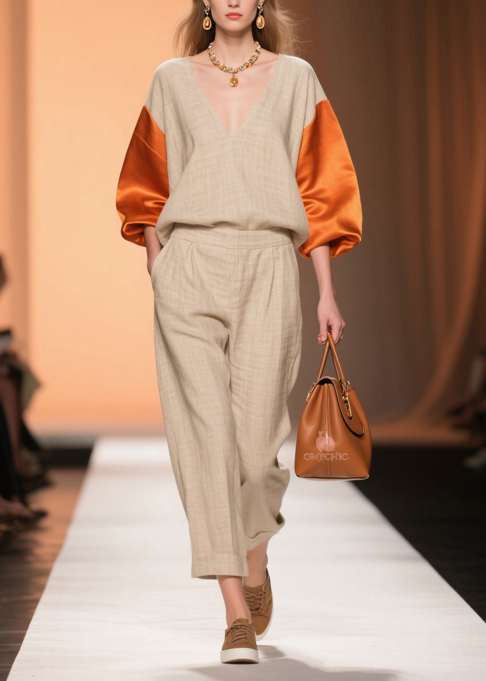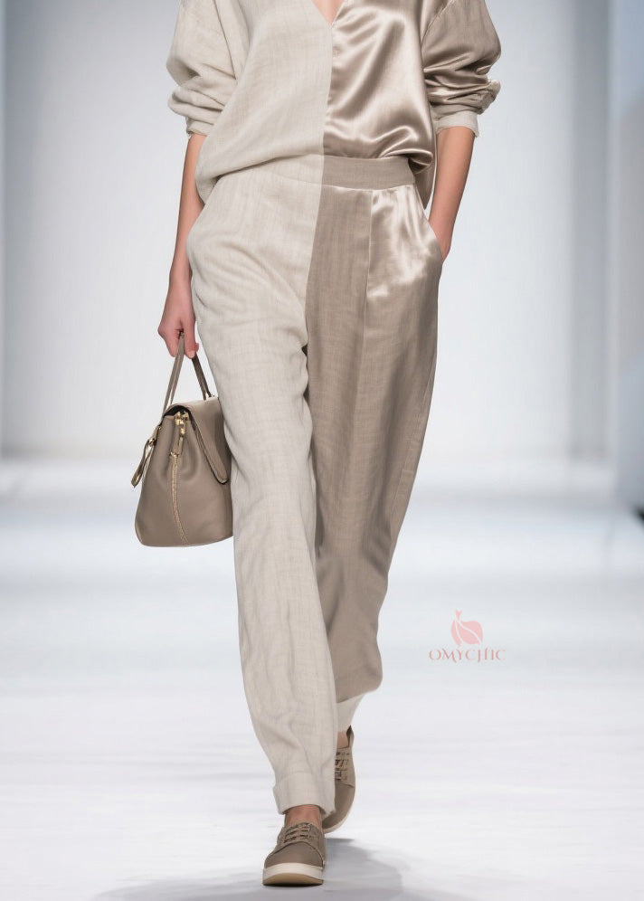Organic Colorblock V Neck Silk Patchwork Linen Sets 2 Pieces Spring