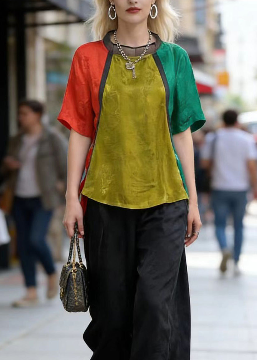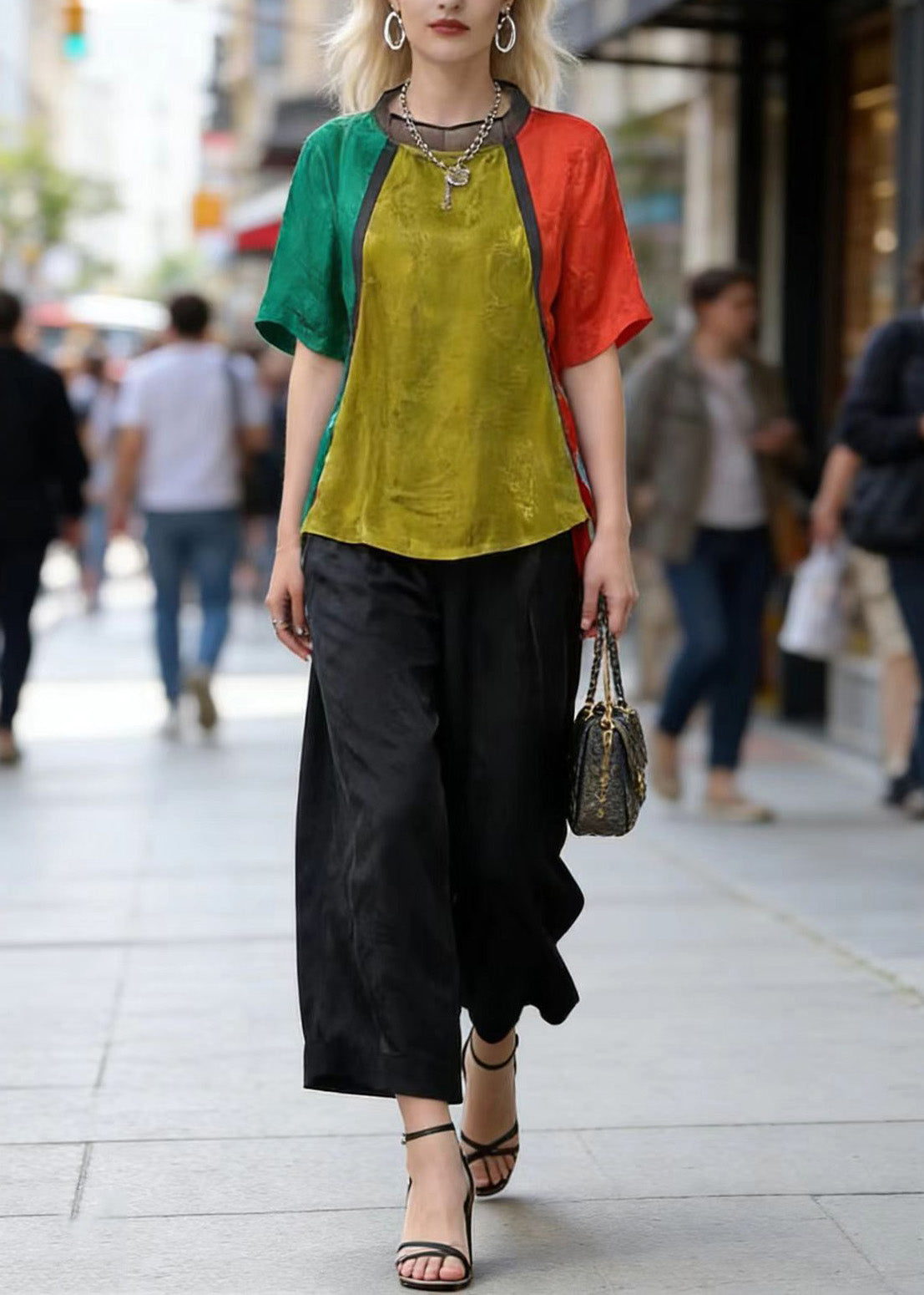 Art Colorblock Jacquard Top And Crop Pants Silk Two Pieces Set Summer