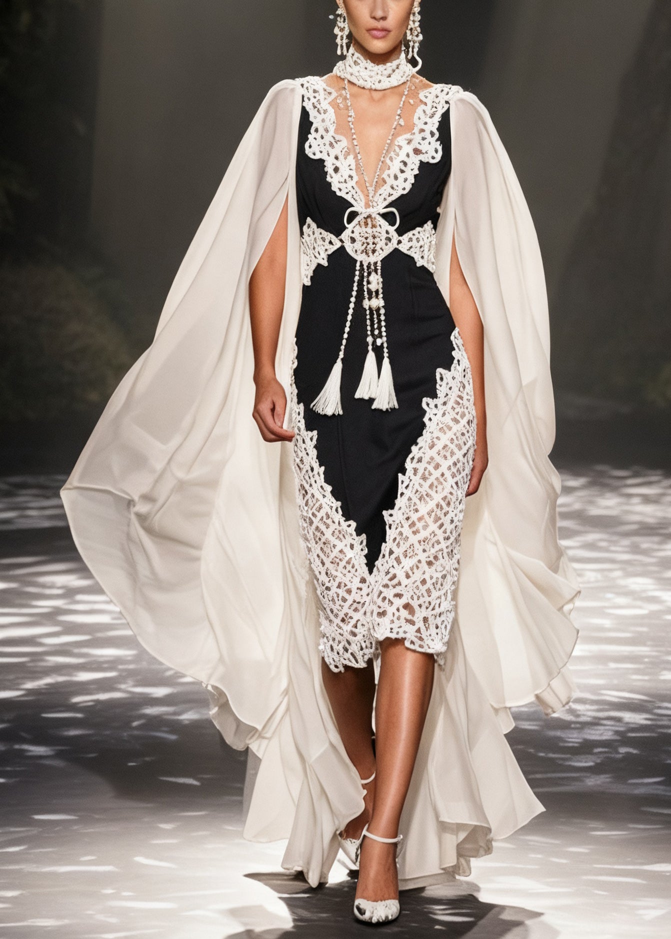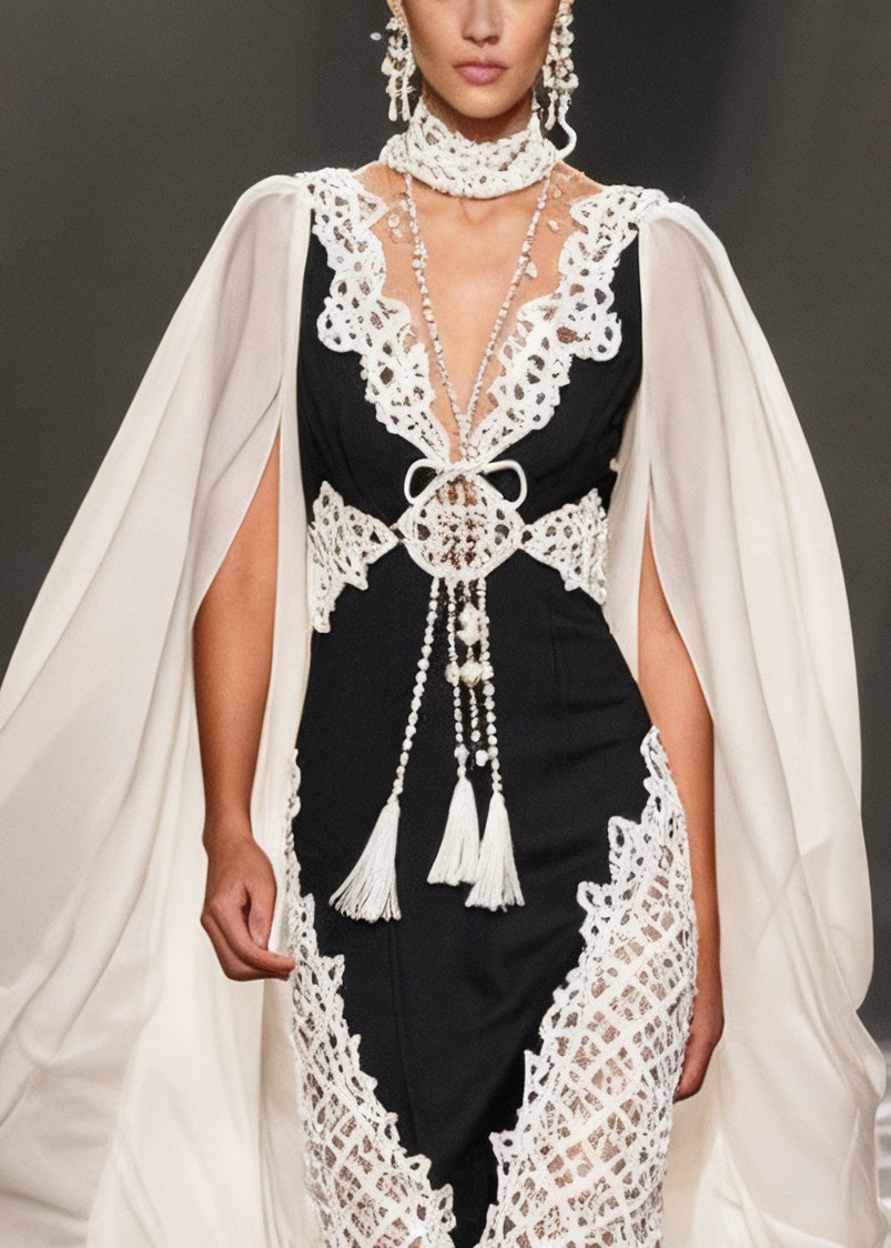 Original Design Colorblock Hollow Out Chiffon Patchwork Long Dresses Shawl Sleeve