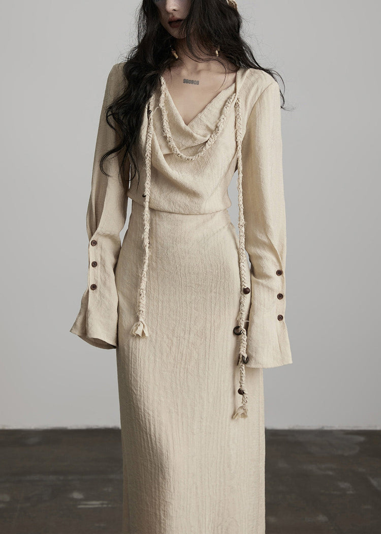 Unique Beige Button Lace Up Cotton Maxi Dress Fall
