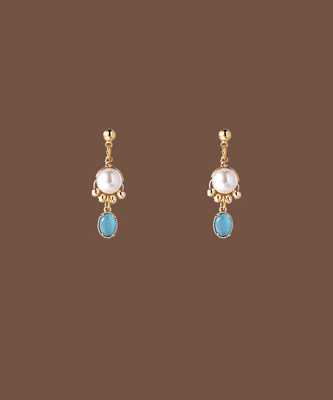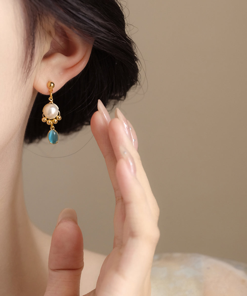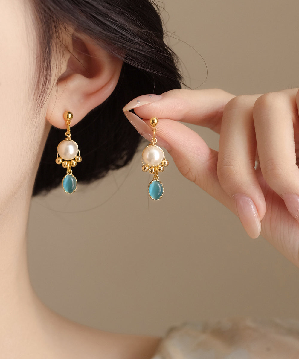 Original Gold Copper Alloy Cat Eye Stone Pearl Tassel Drop Earrings