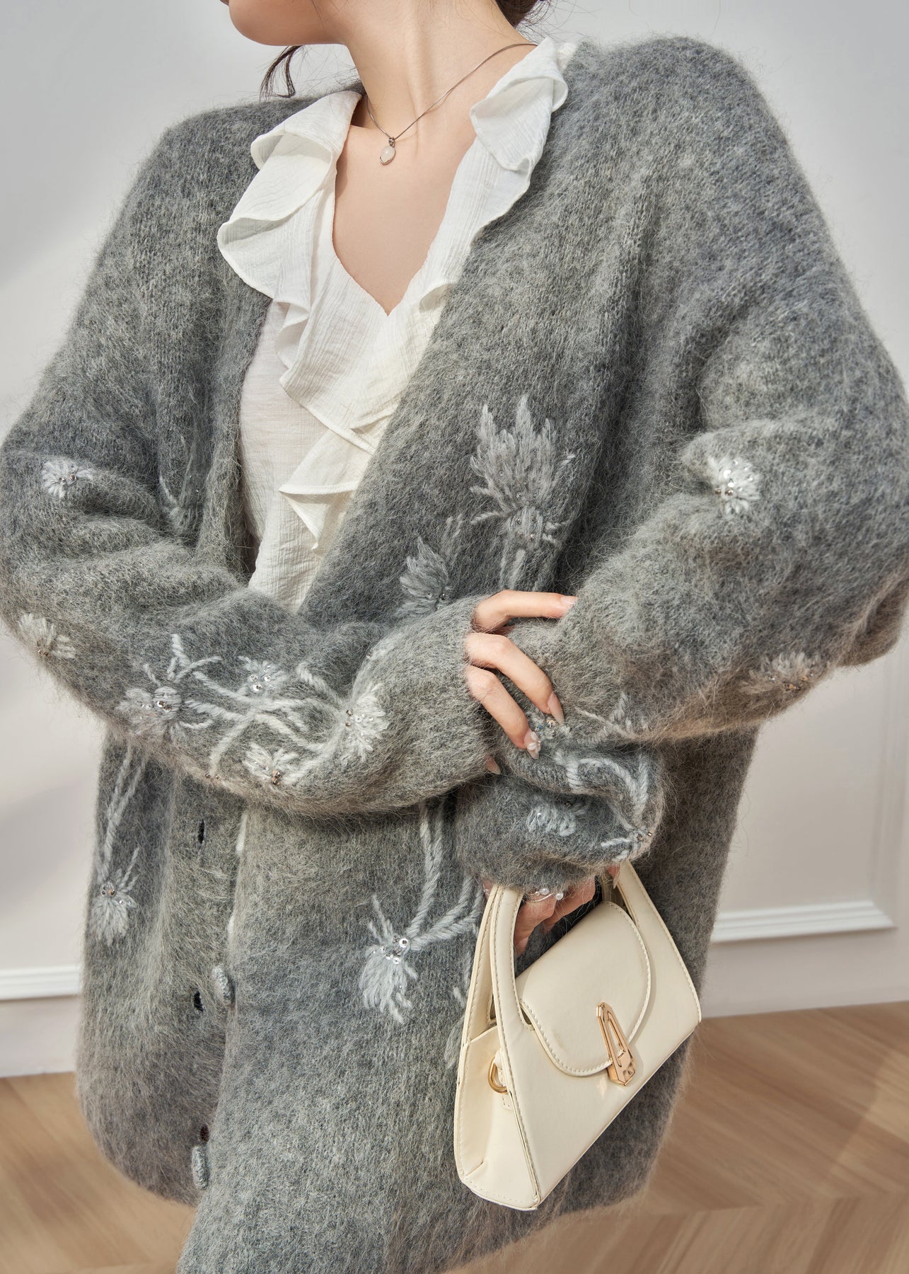 Casual Grey V Neck Embroidered Floral Cotton Knit Cardigan Fall