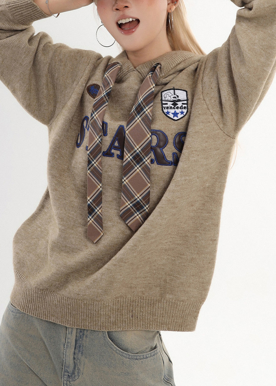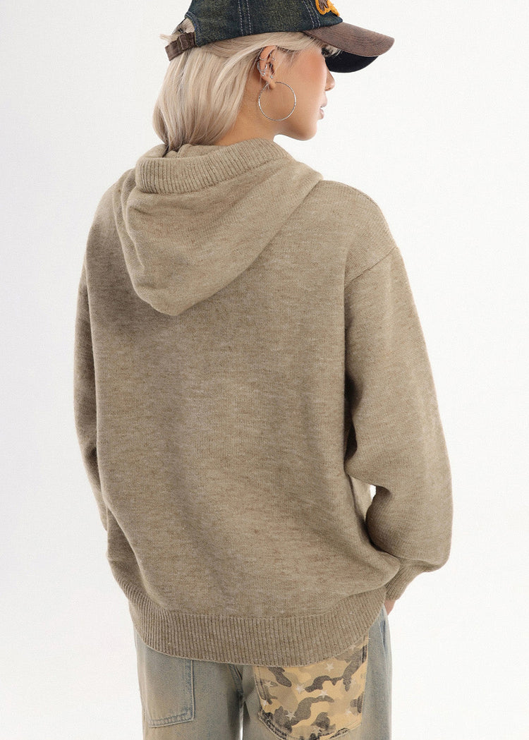Chic Coffee Hooded Embroidered Knit Sweatshirt Winter