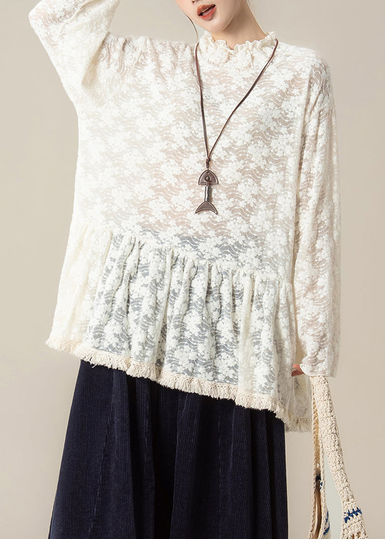 Handmade Beige Embroidered Ruffled Lace Blouses Spring
