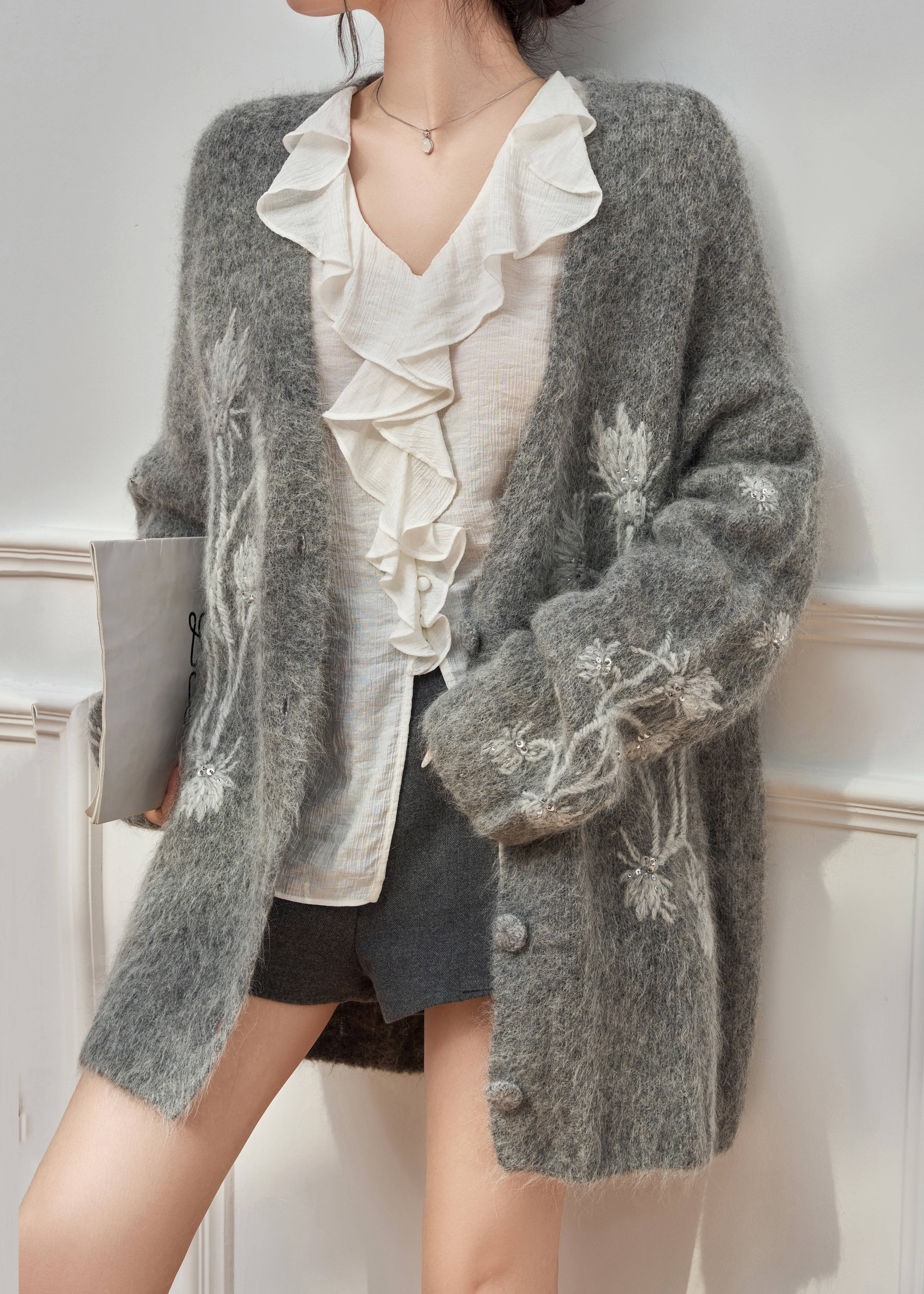 Casual Grey V Neck Embroidered Floral Cotton Knit Cardigan Fall