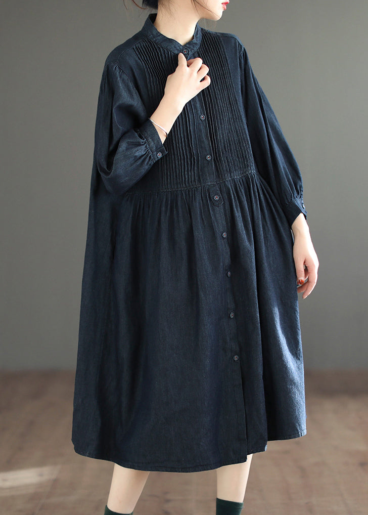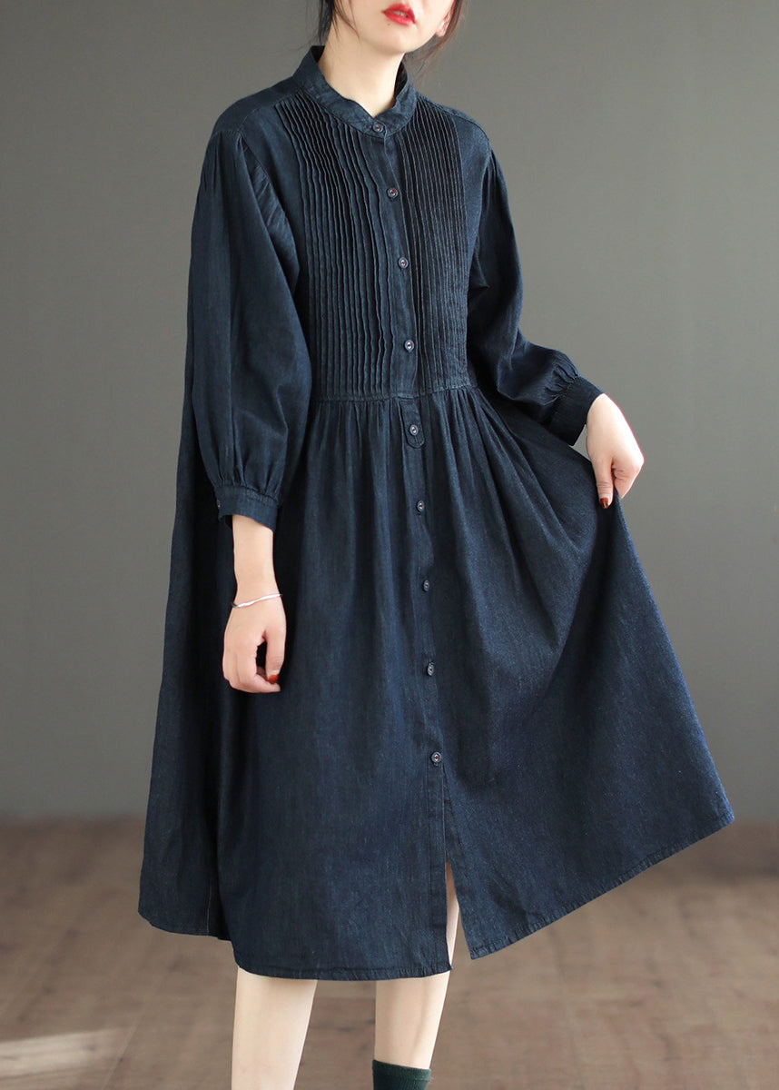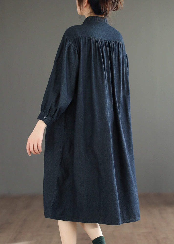 Navy Solid Button Denim Blouses Dresses O Neck Long Sleeve