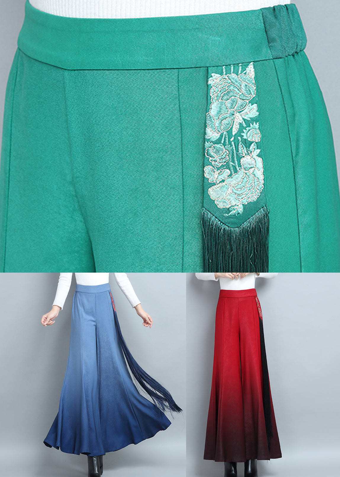 Vintage Red Embroidered High Waist Cotton Wide Leg Pants