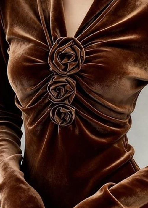 Elegant Coffee V Neck Wrinkled Floral Silk Velour T Shirt Winter