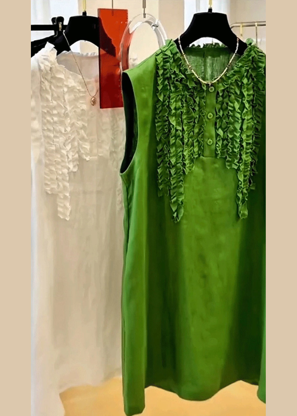 Elegant Green Ruffled Button Solid Cotton Mid Dress Sleeveless