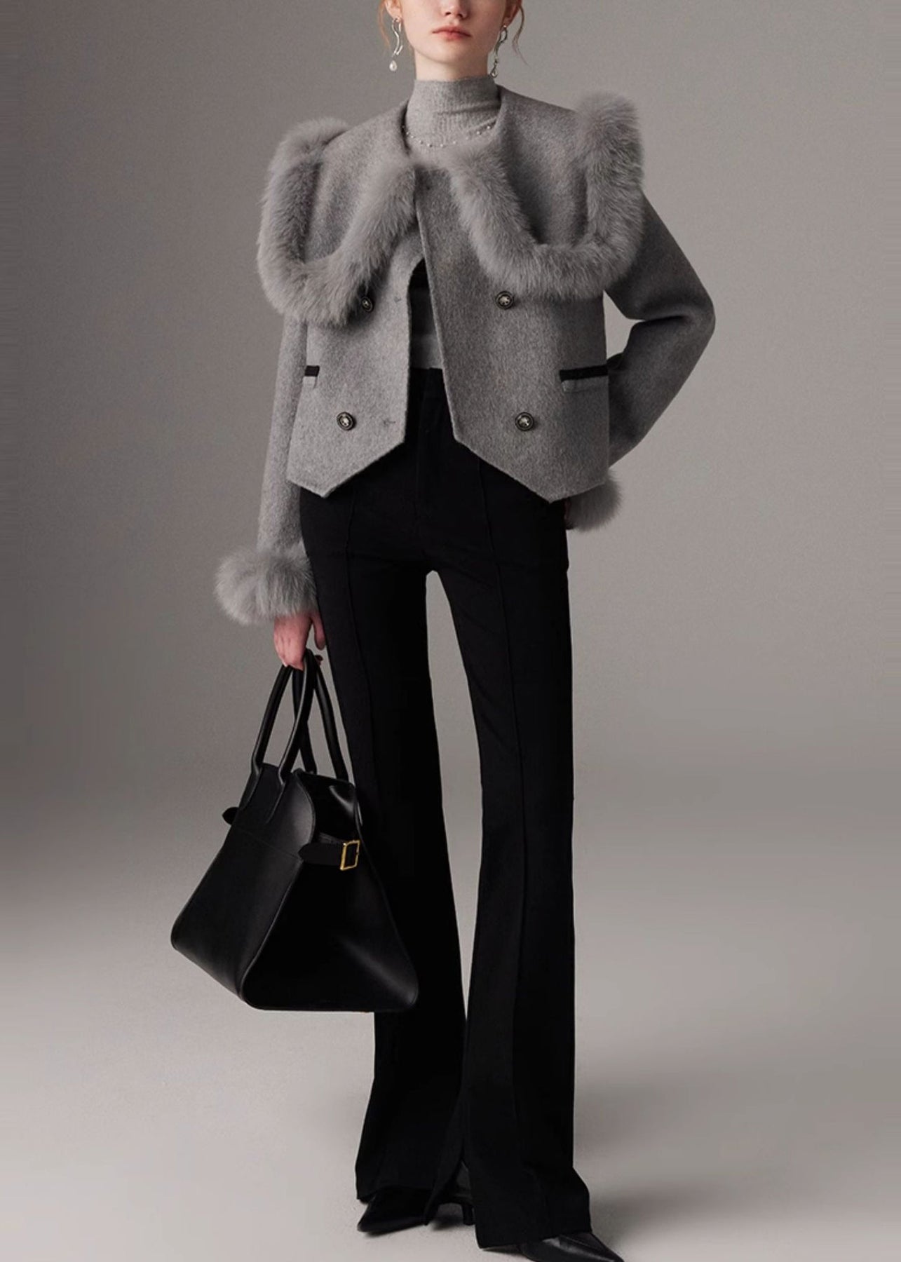 Grey Patchwork Wool Coat Peter Pan Collar Double Breast Winter