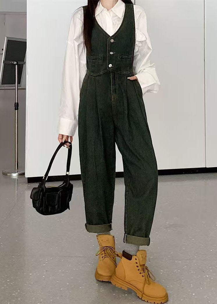 Slim Fit Denim Blue Button Pockets High Waist Jumpsuits Sleeveless