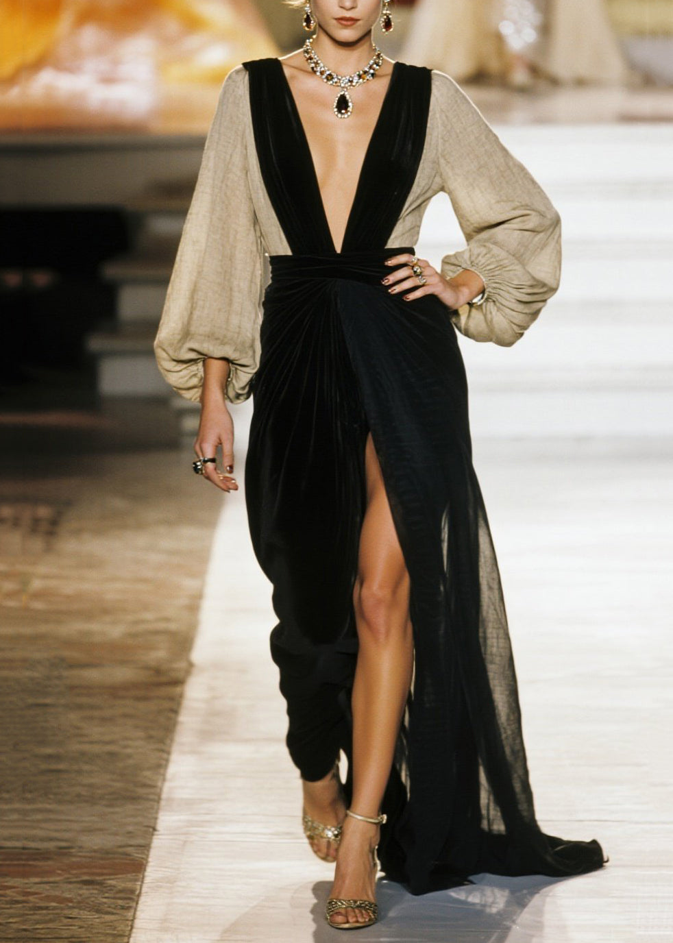 Art V Neck Lace Patchwork Velvet Maxi Dresses Lantern Sleeve