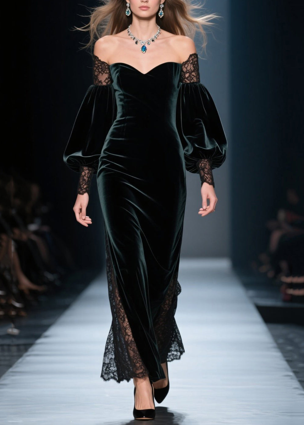Fashion Blackish Green Cold Shoulder Lace Patchwork Velvet Dresses Fall
