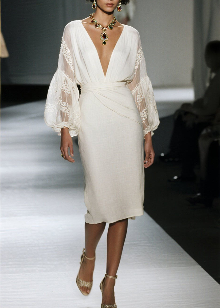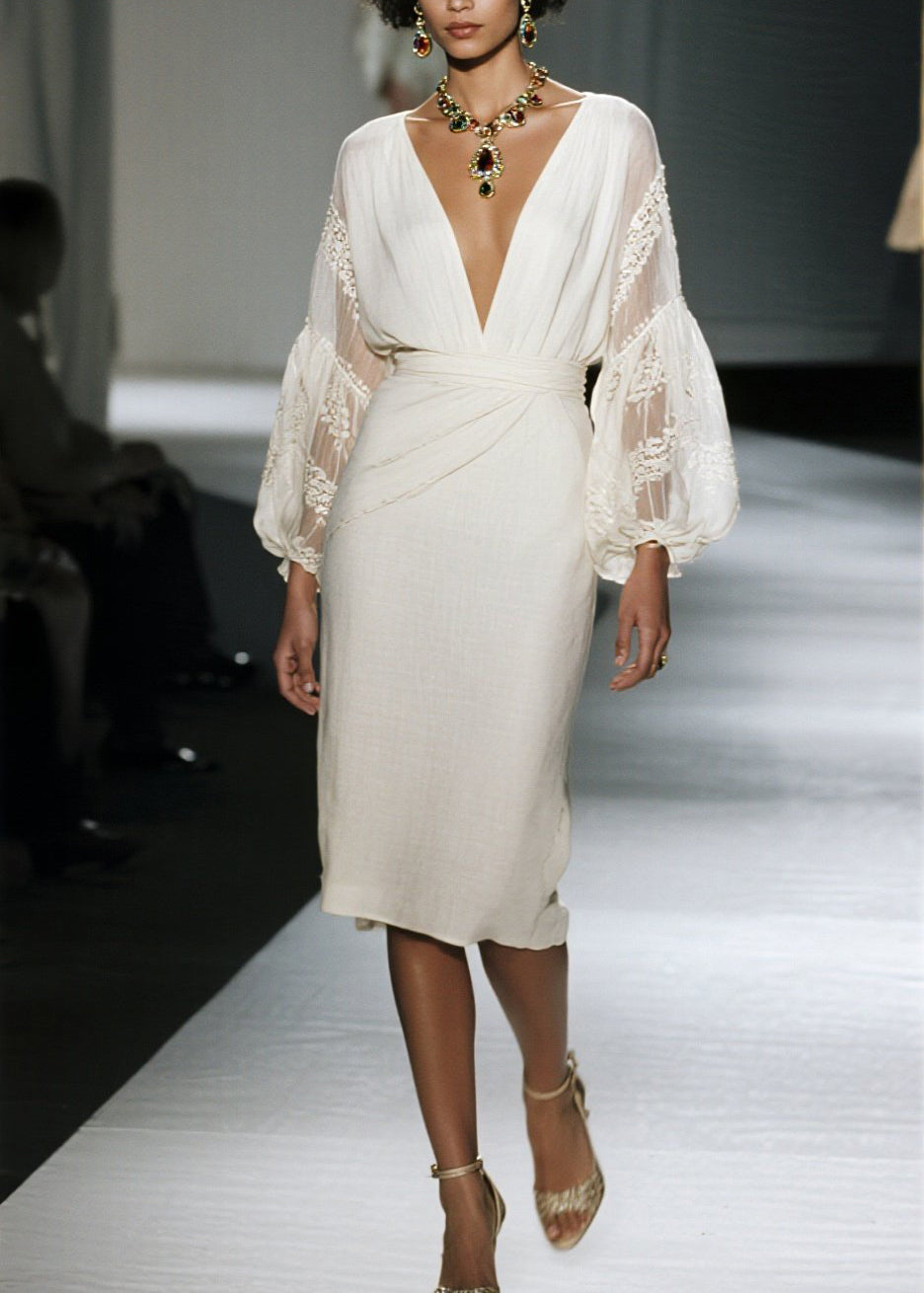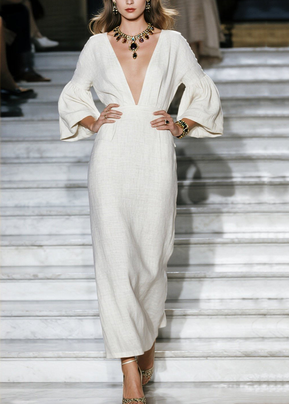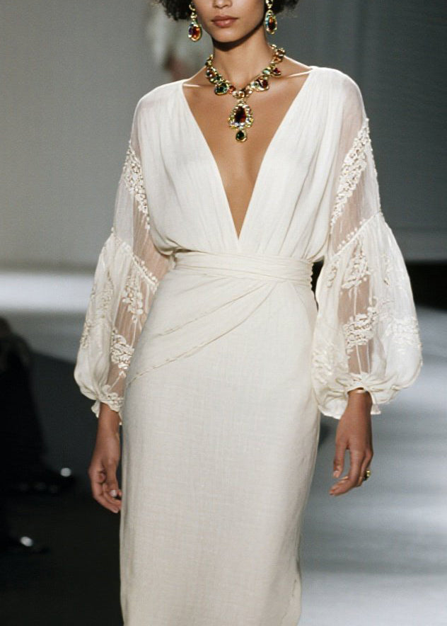 Unique Beige V Neck Patchwork Cotton Long Dresses Fall