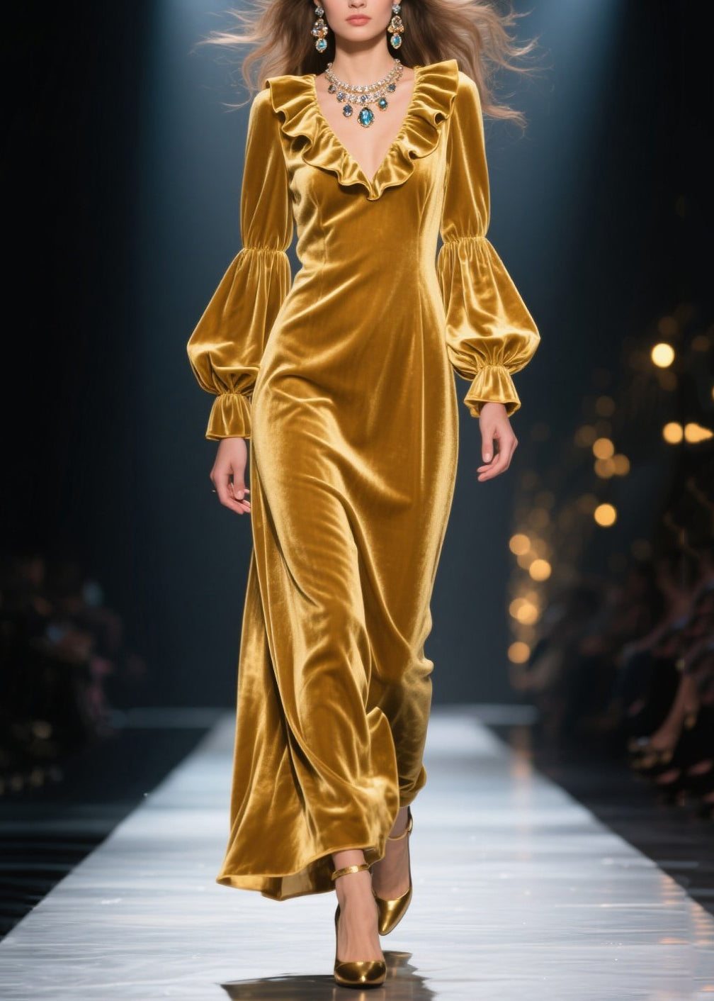 Original Design Yellow Ruffled Patchwork Velvet Long Dress Fall