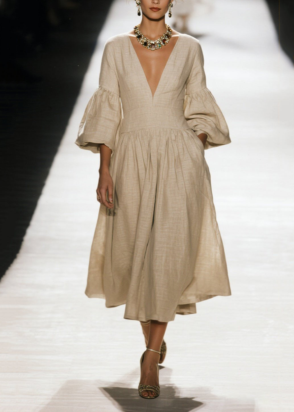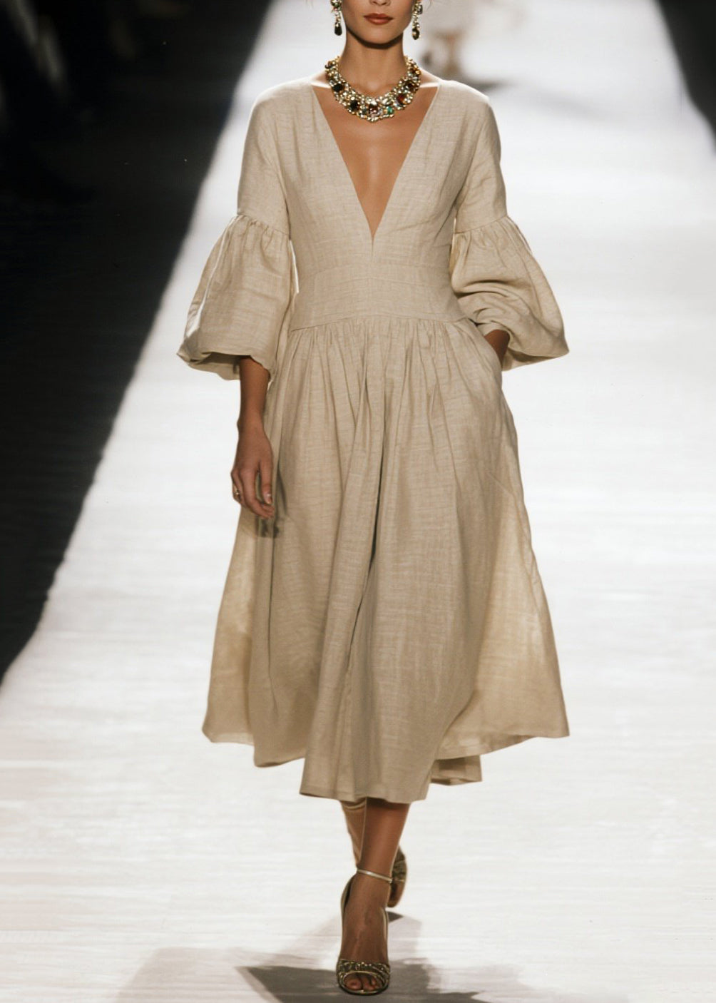 Natural Beige V Neck Patchwork Cotton Dresses Lantern Sleeve