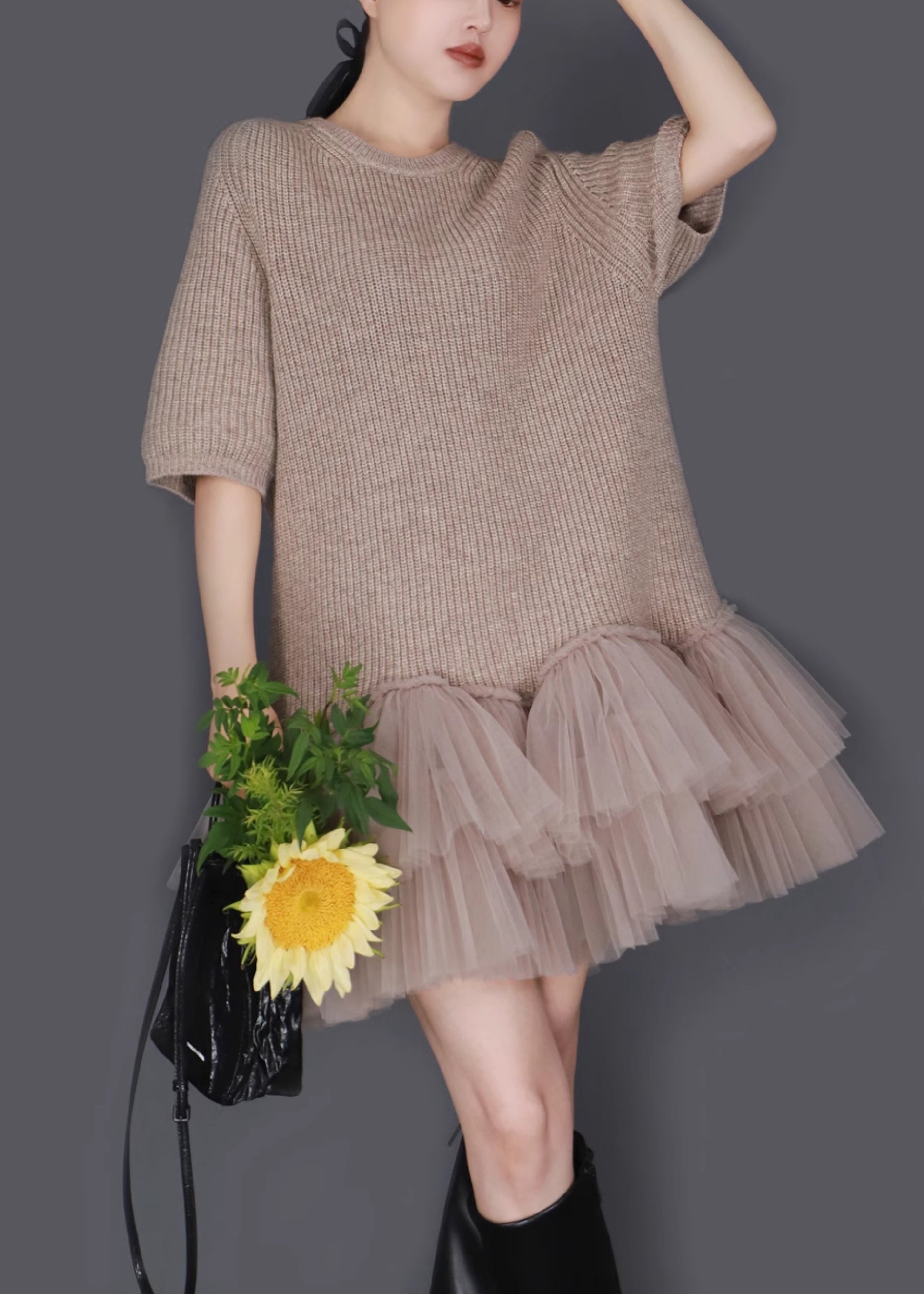 Elegant Oatmeal Color O Neck Wrinkled Tulle Patchwork Knit Sweater Dress