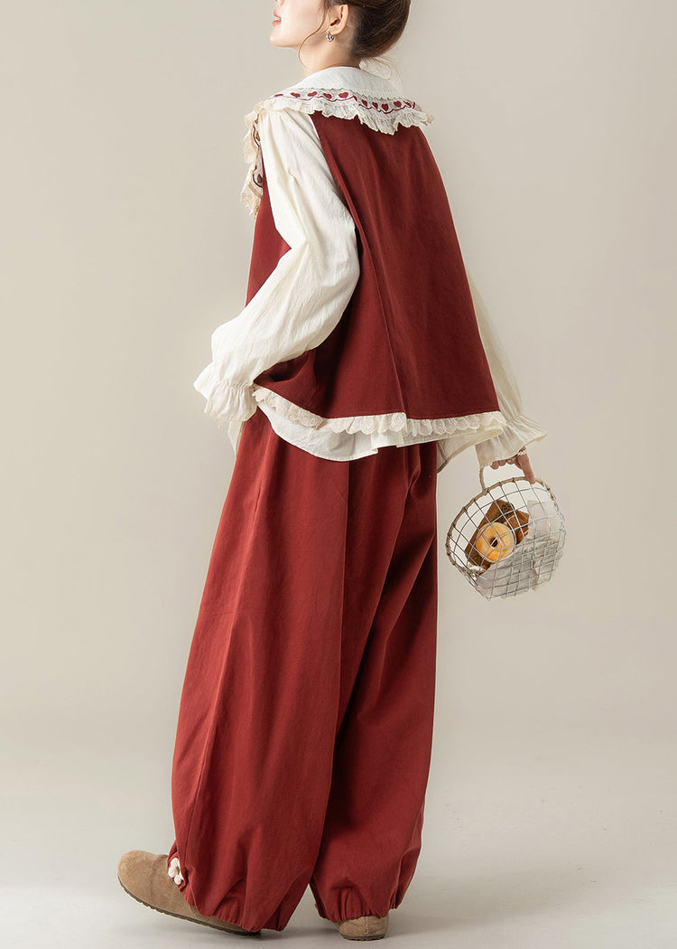 Floral Red Peter Pan Collar Lace Patchwork Cotton Three Piece Set Fall