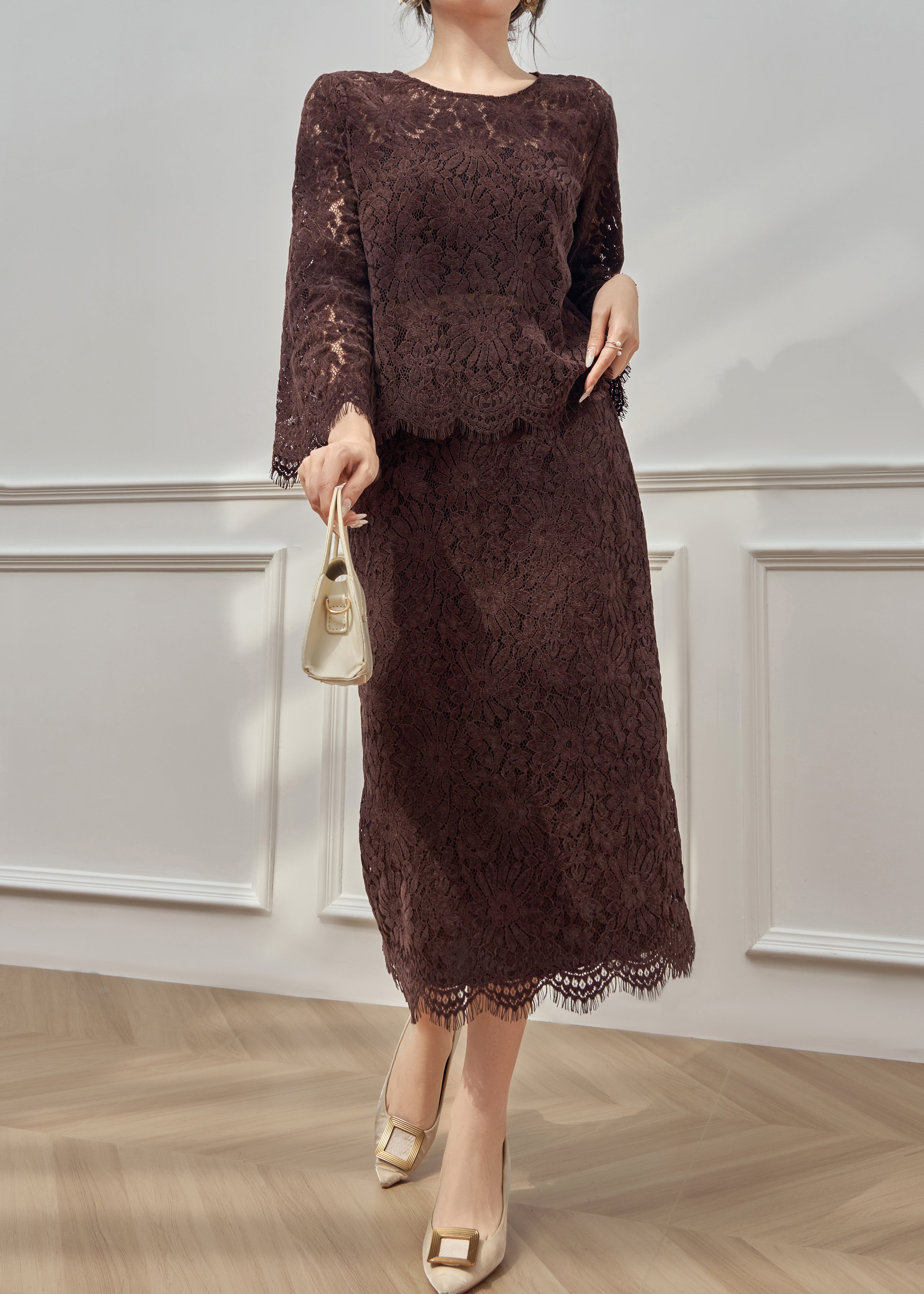 Elegant Coffee O Neck Hollow Out Lace Two Pieces Set Fall