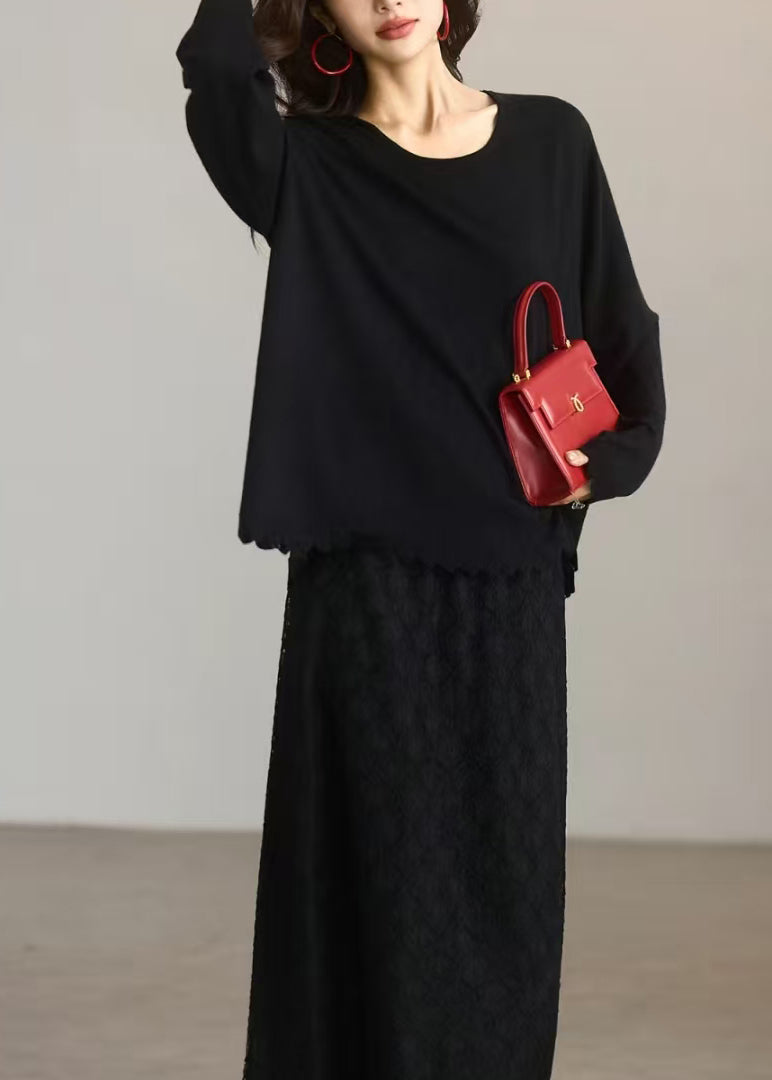 Black Elastic Waist Solid Lace Skirt Hollow Out