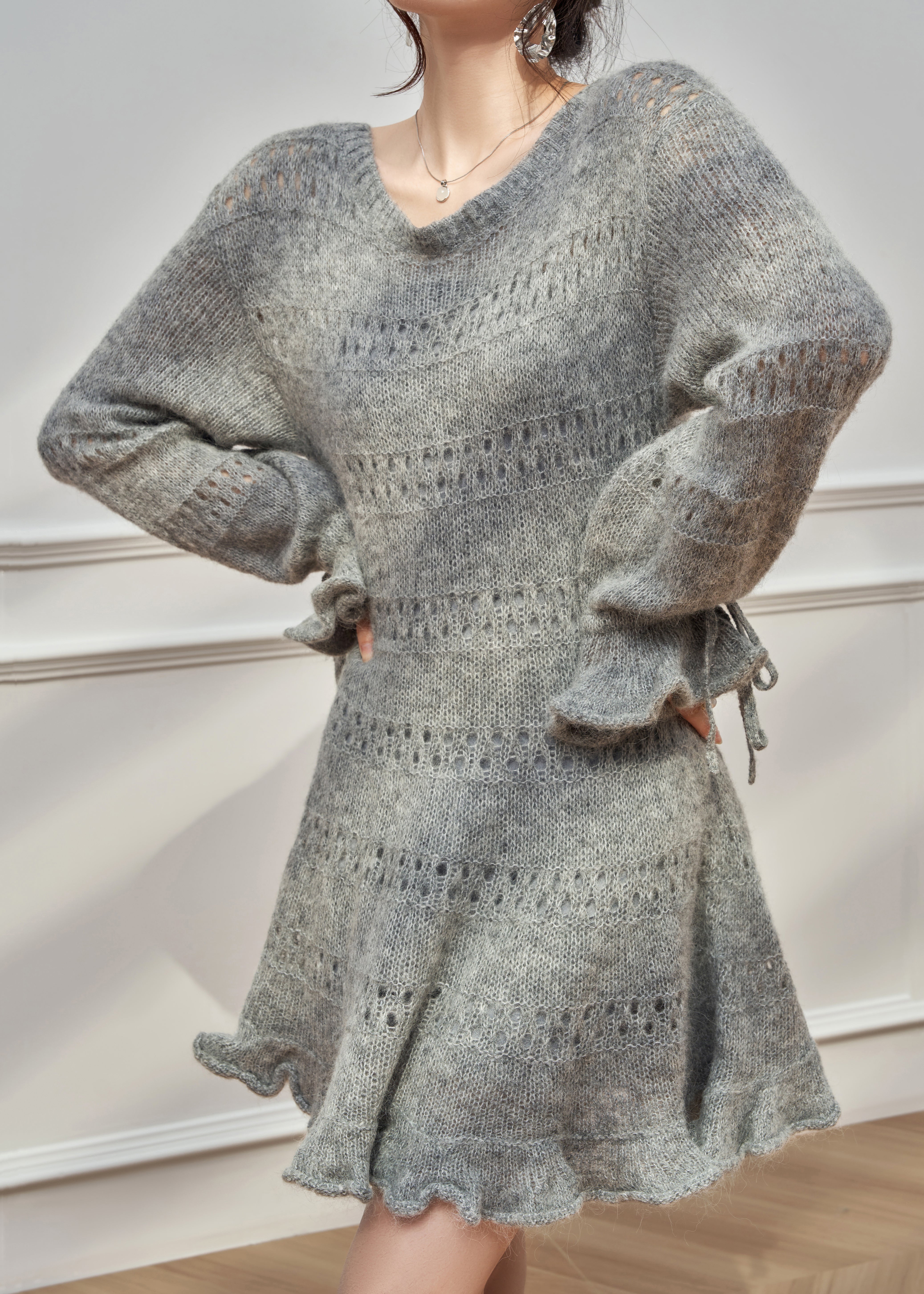 New Grey Ruffled Hollow Out Lace Up Knit Sweater Dress Fall