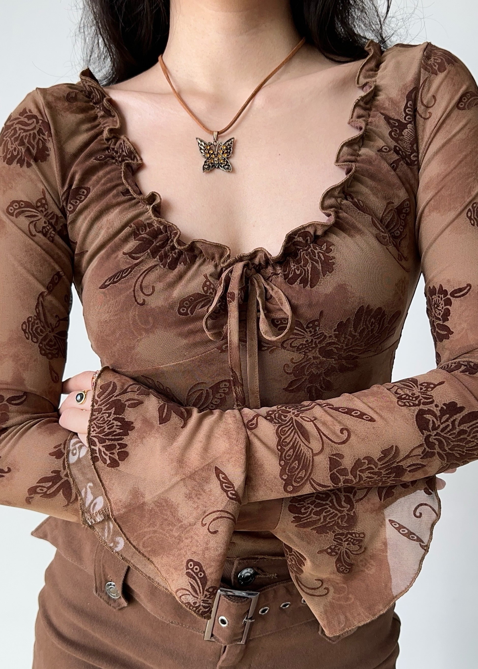 French Brown Oversized Patchwork Lace Pullover Tops Spring