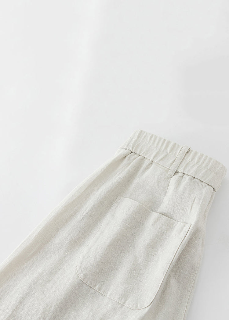 Beige Zippered Solid Elastic Waist Linen Wide Leg Pants