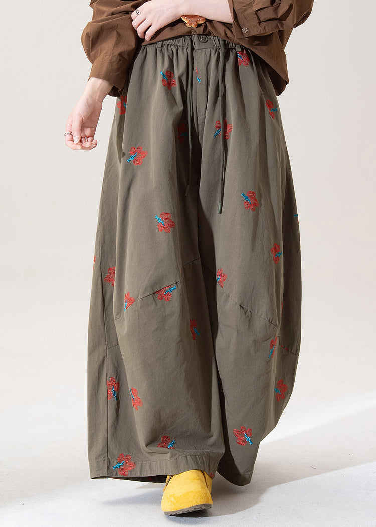 Art Green Embroidered Elastic Waist Cotton Wide Leg Pants Fall
