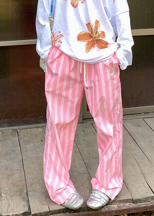 Casual Green Striped Pockets Elastic Waist Cotton Pants Summer