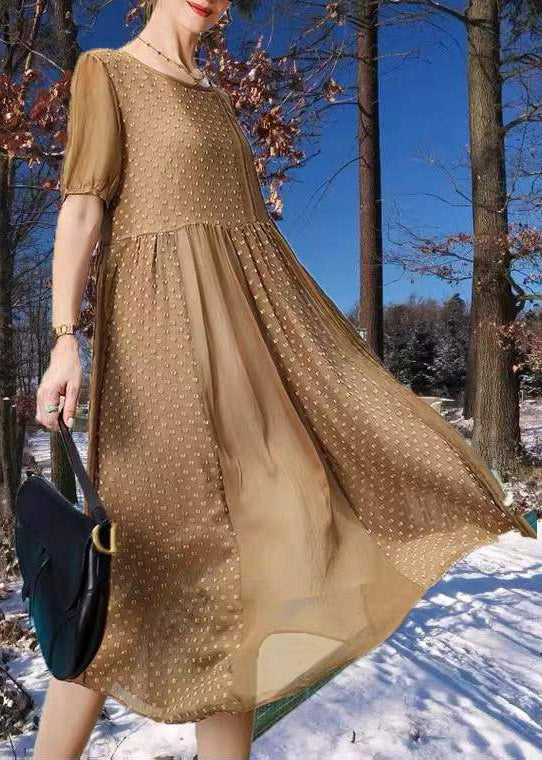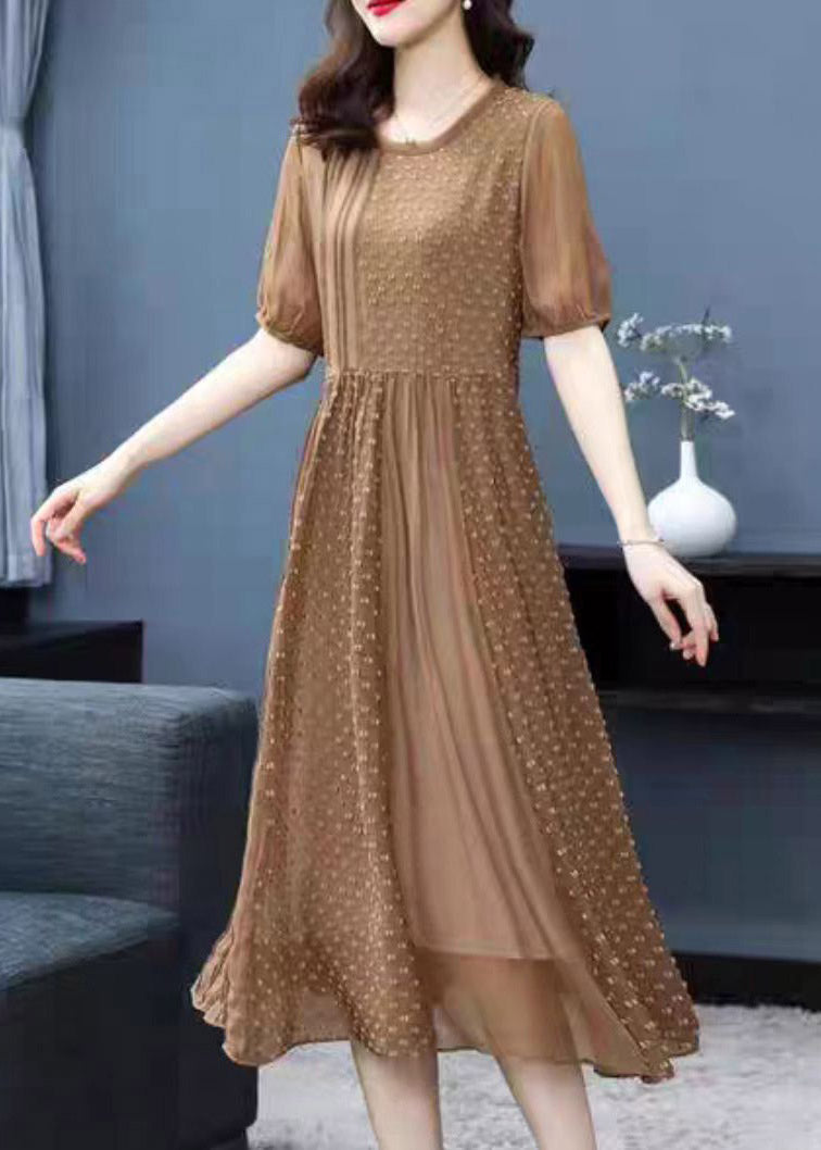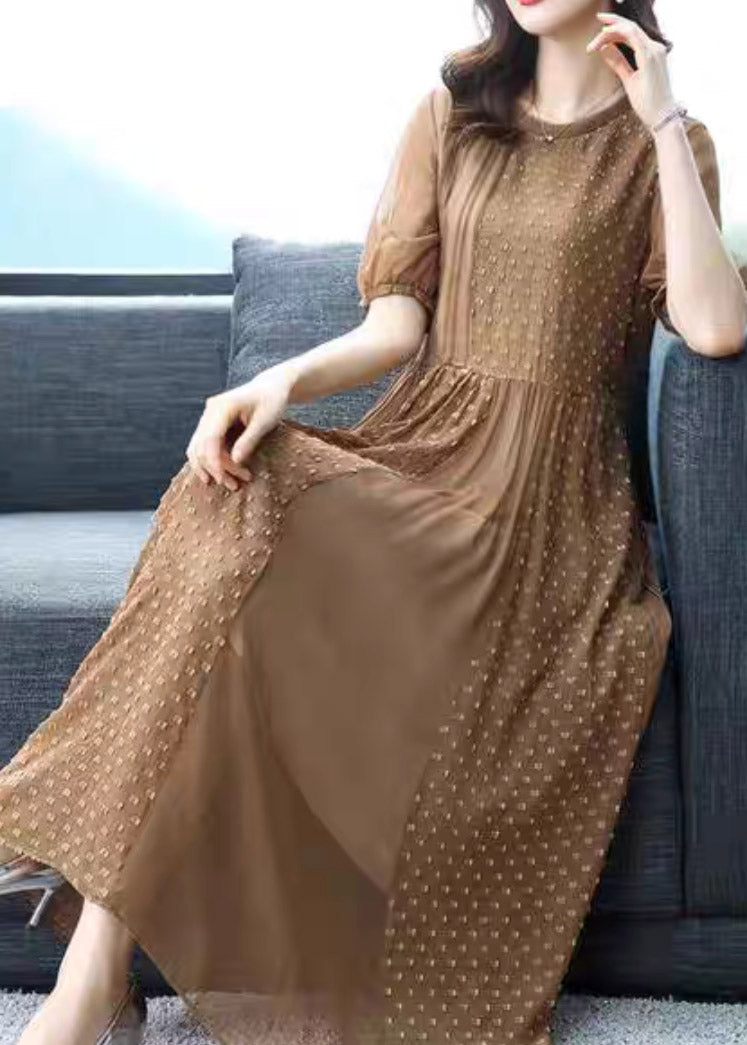Brief Brown O-Neck Patchwork Silk Maxi Dress Short Sleeve