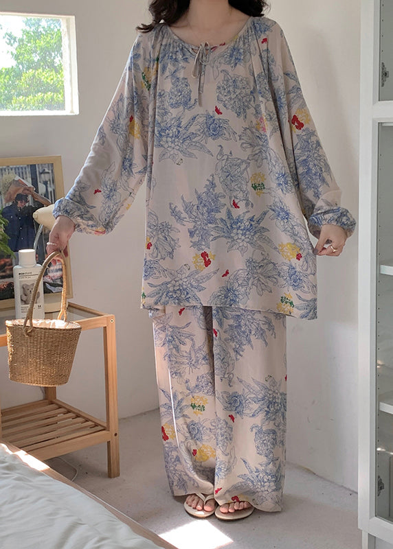 Cute Apricot O-Neck Print Silk Velvet Top And Pants Two Pieces Set Long Sleeve
