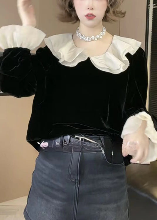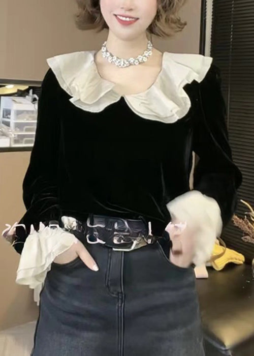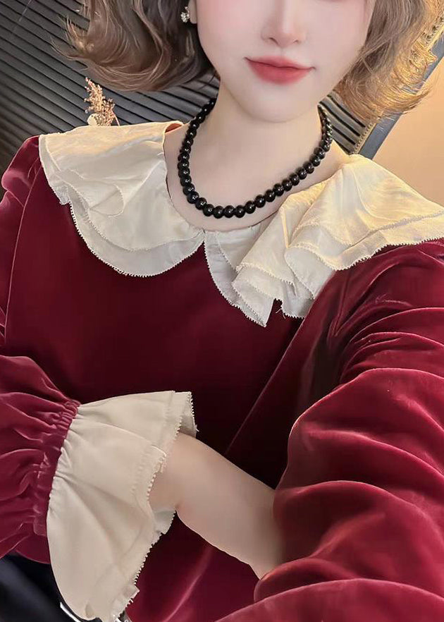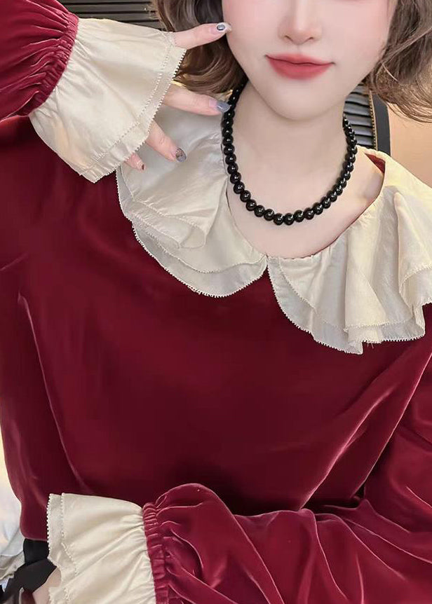 New Wine Red Ruffled Solid Silk Velour Shirt Spring