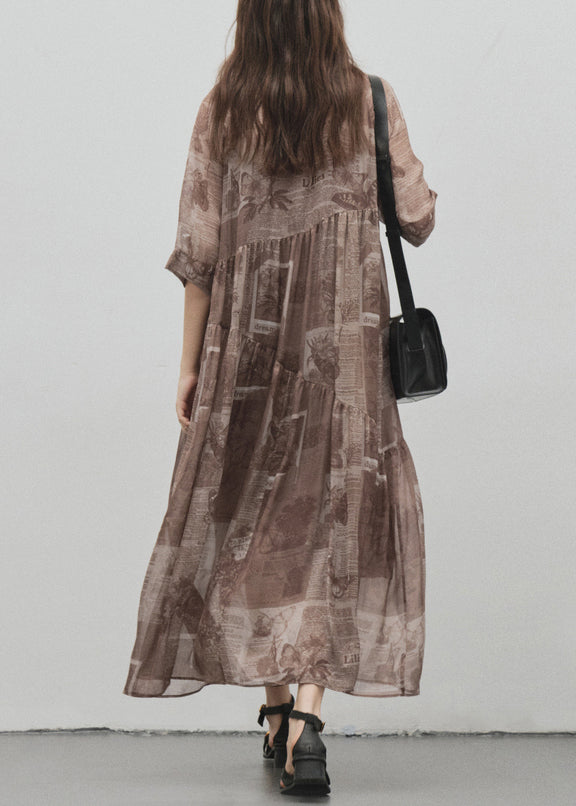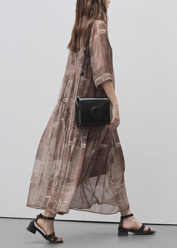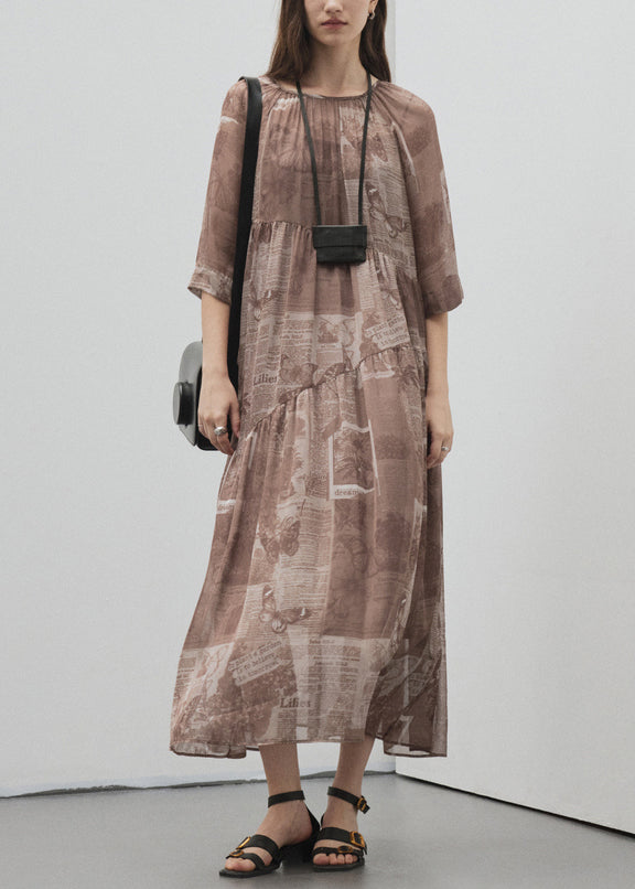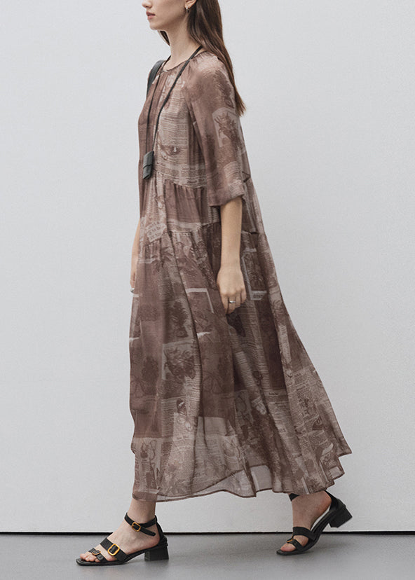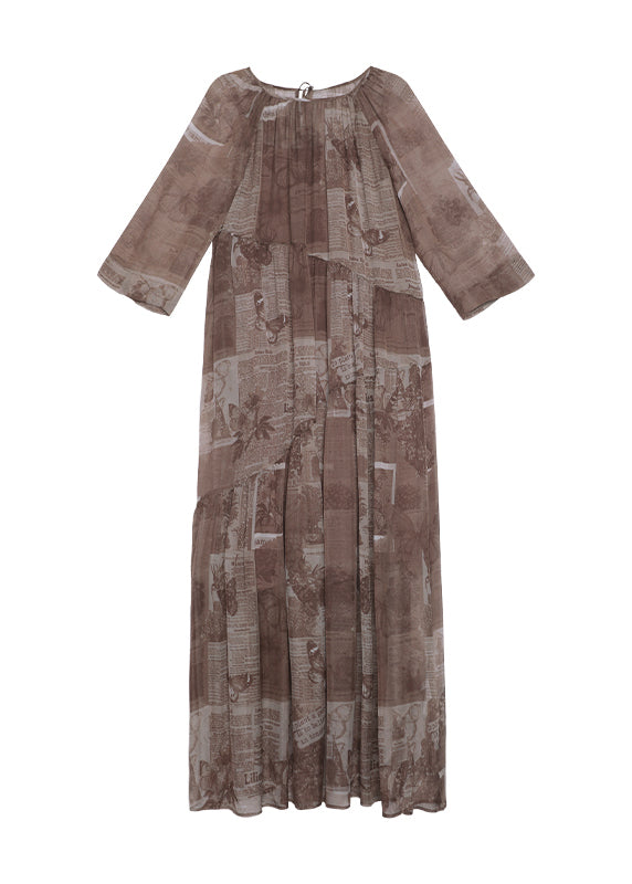 Style Brown O Neck Print Patchwork Silk Long Dress Summer