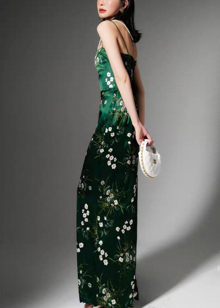 Stylish Green Print Side Open Silk Spaghetti Strap Dress Sleeveless