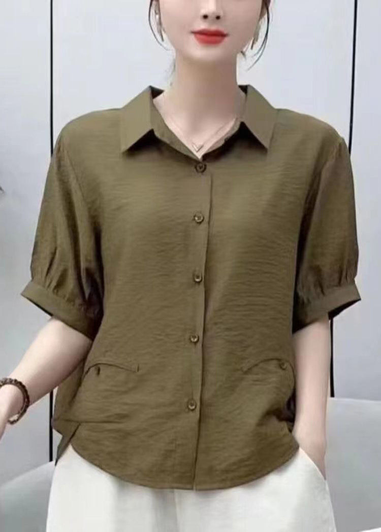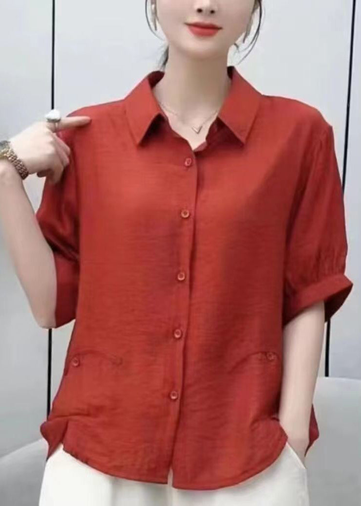 Women Red Peter Pan Collar Low High Design Silk Shirt Short Sleeve