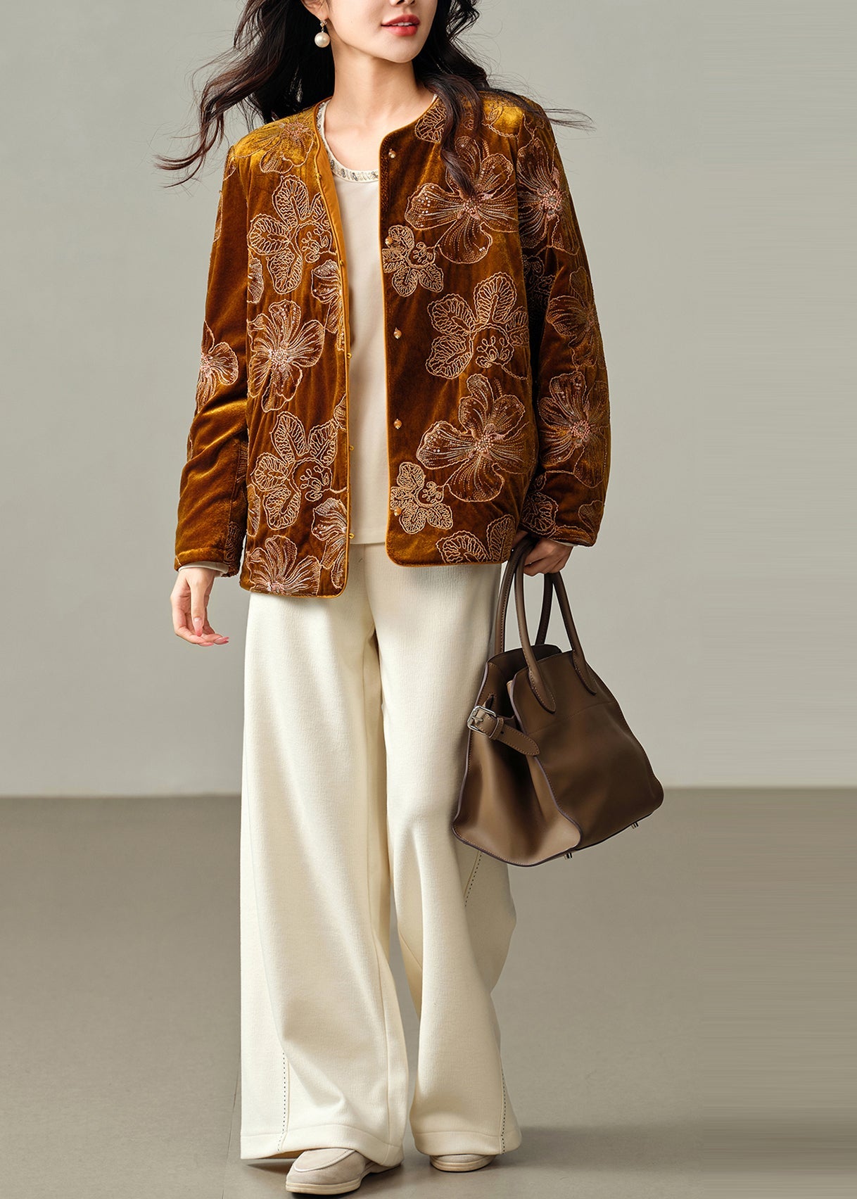 French Yellow Embroidered Fine Cotton Filled Silk Velvet Jacket Winter