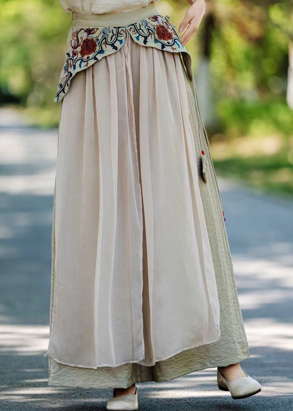Vintage Khaki Pockets Embroidered Patchwork Silk Pants Fall