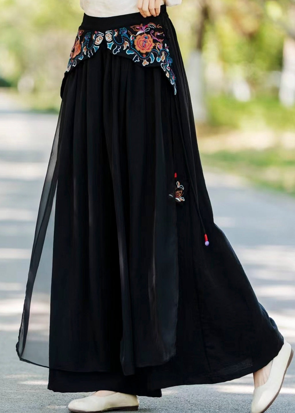 Black Pockets Silk Skirt Embroidered Oriental Button Fall