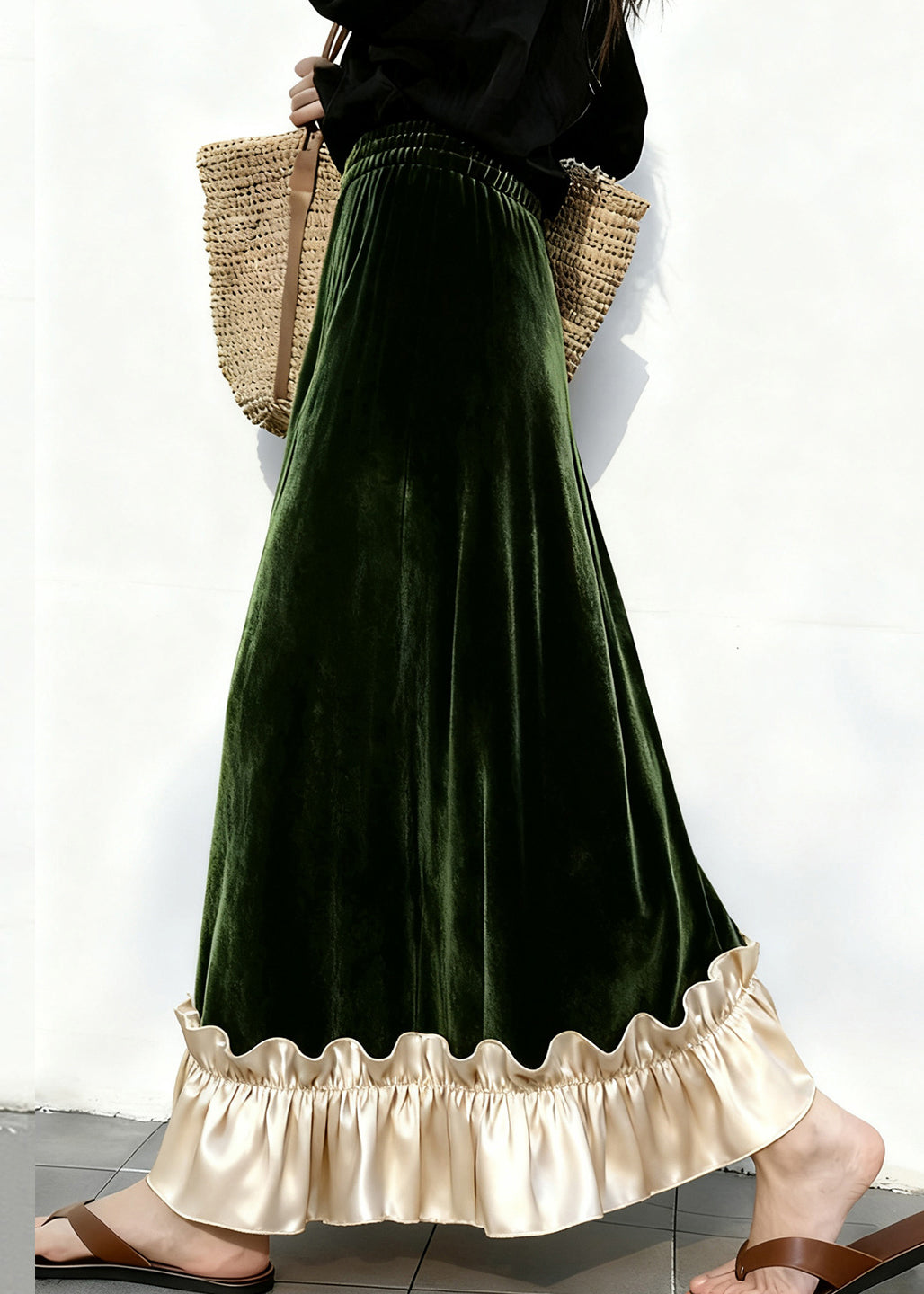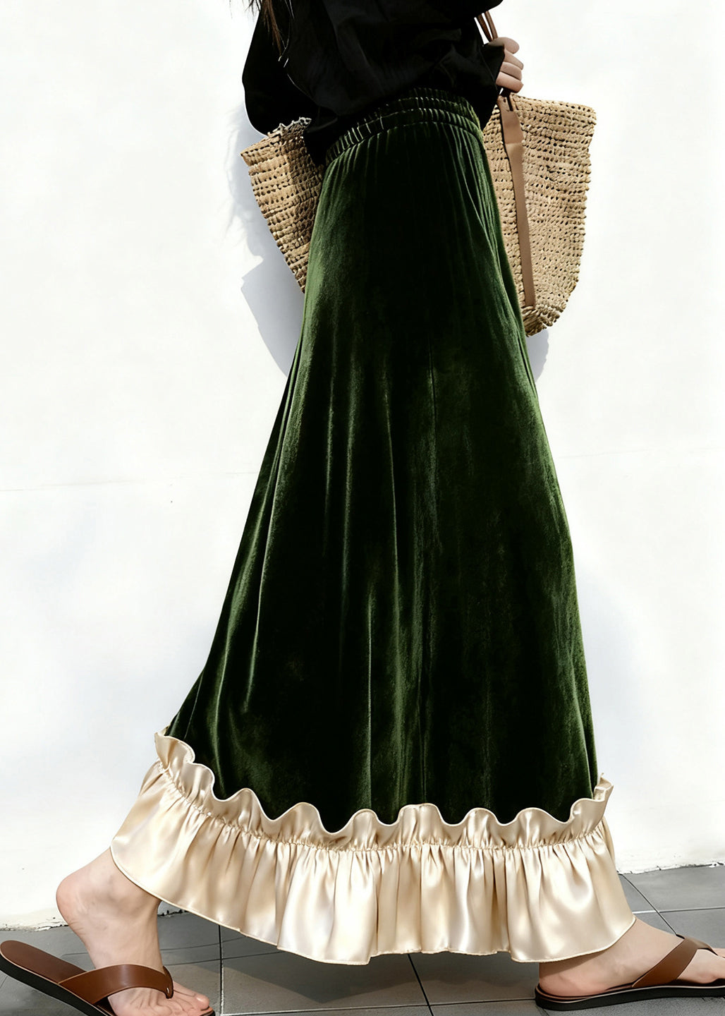 Elegant Black Ruffled Elastic Waist Patchwork Velour Skirt Winter