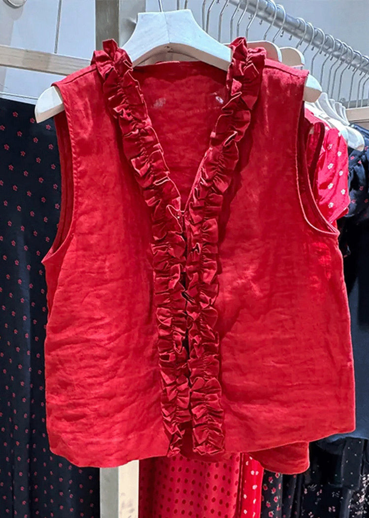 Simple Red V Neck Ruffled Cotton Blouse Top Sleeveless