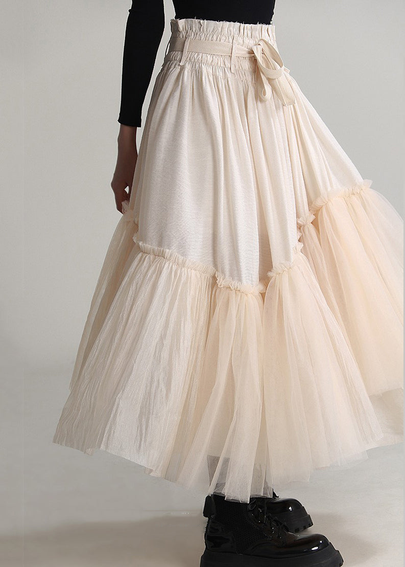 Art Apricot Ruffled Lace Up Tulle Patchwork Skirts Spring