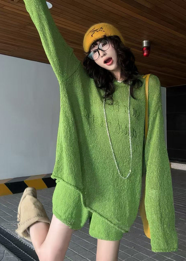 Casual Grass Green Embroidered Letter Knit Two-Piece Set Spring