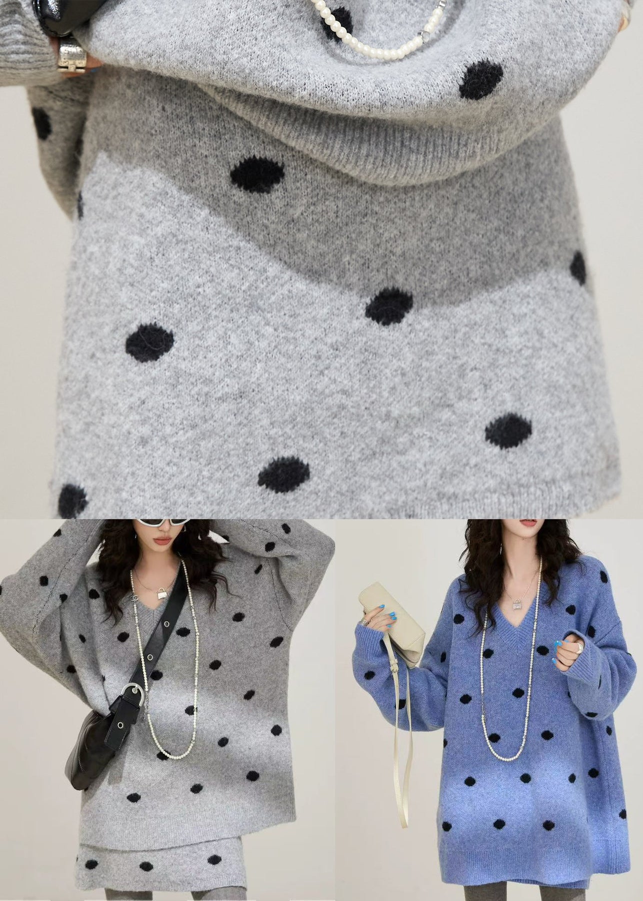Fitted Blue Oversized Dot Knit Two Pieces Set Winter